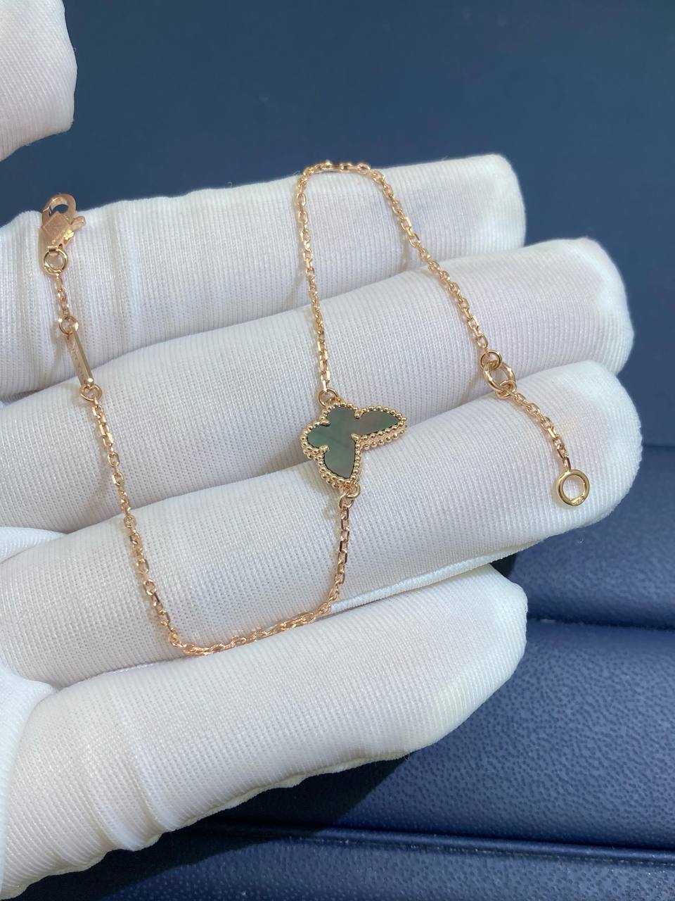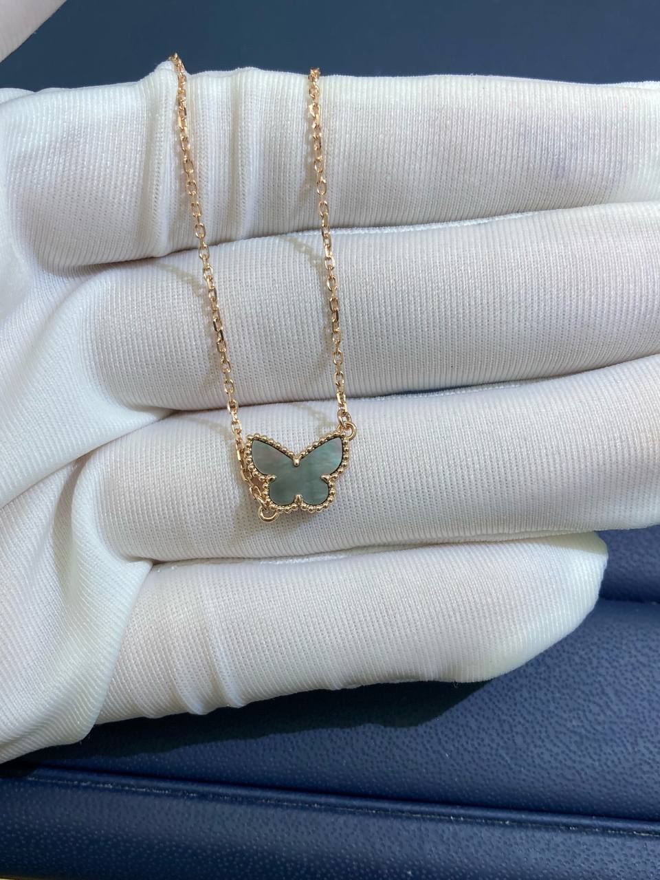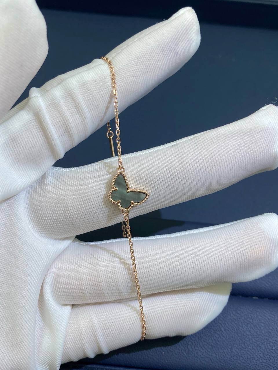 This iconic butterfly bracelet showcases a beautifully crafted grey mother-of-pearl motif, suspended gracefully from a delicate 18k rose gold chain. Elegant and versatile, it is perfect for everyday wear and promises to remain a timeless and wearable piece of art.
