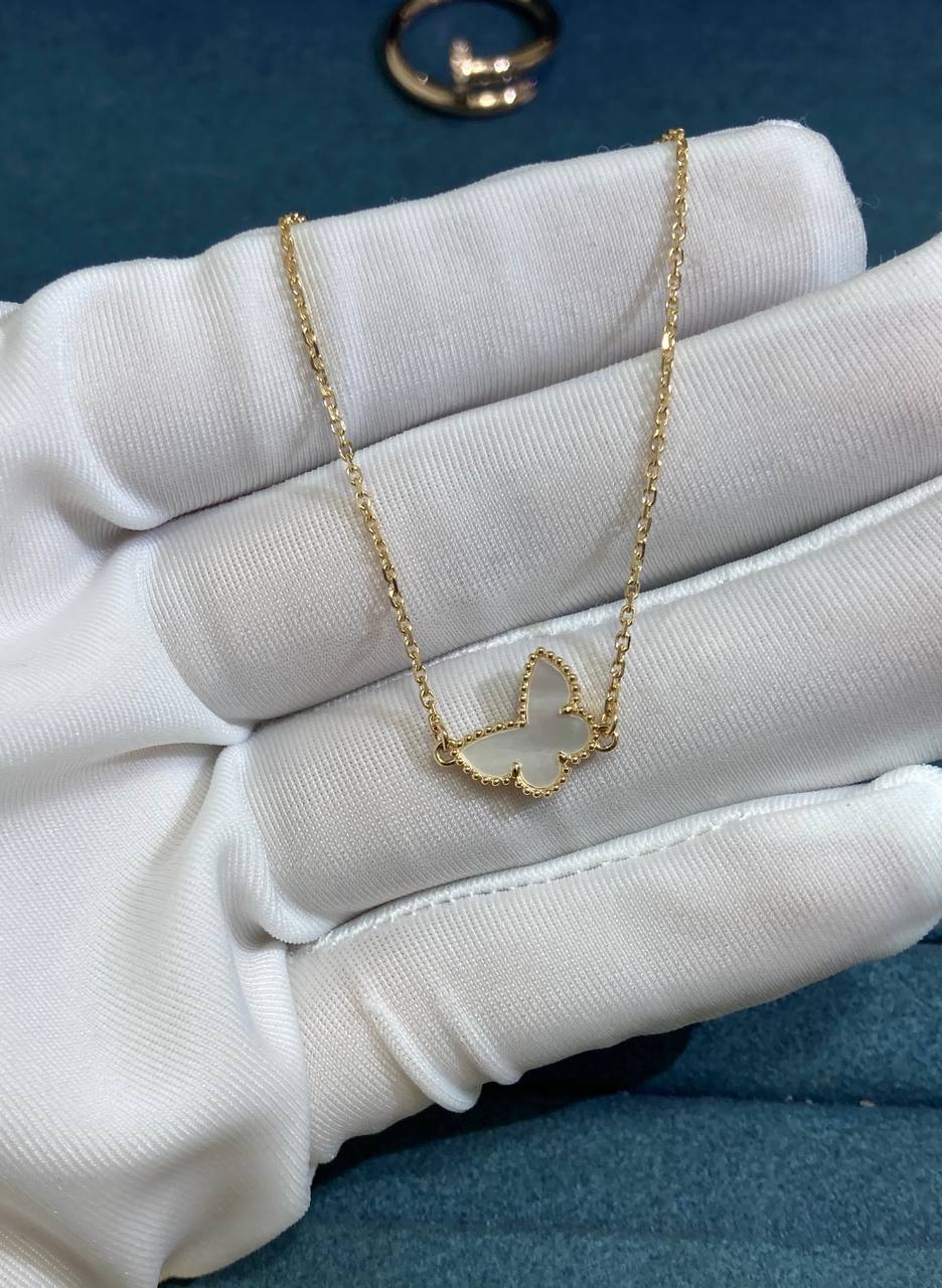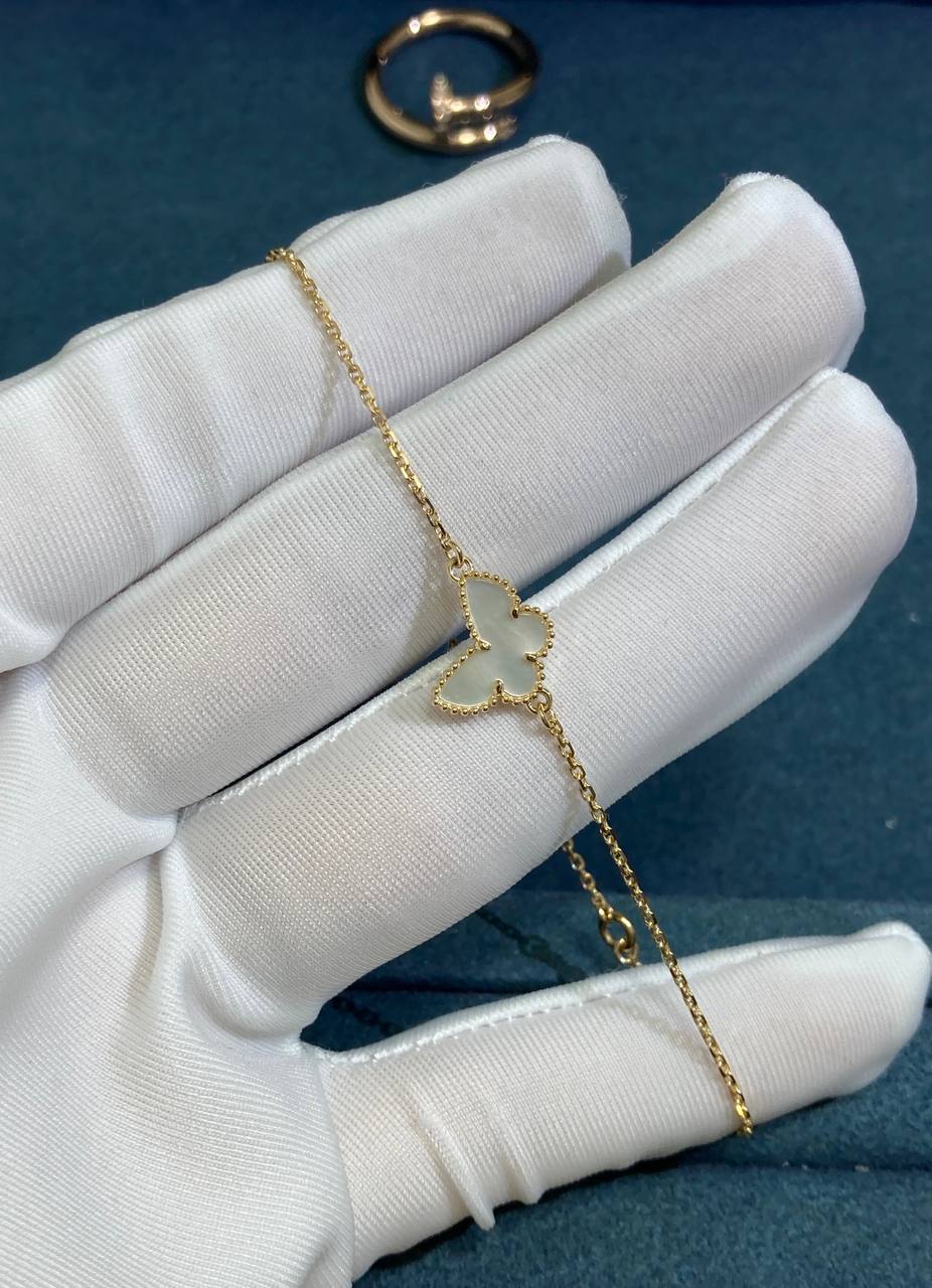 This iconic butterfly bracelet features a stunning mother-of-pearl motif, suspended gracefully from a delicate 18k yellow gold chain. Elegant and versatile, it is perfect for everyday wear and remains a timeless, wearable piece of art.