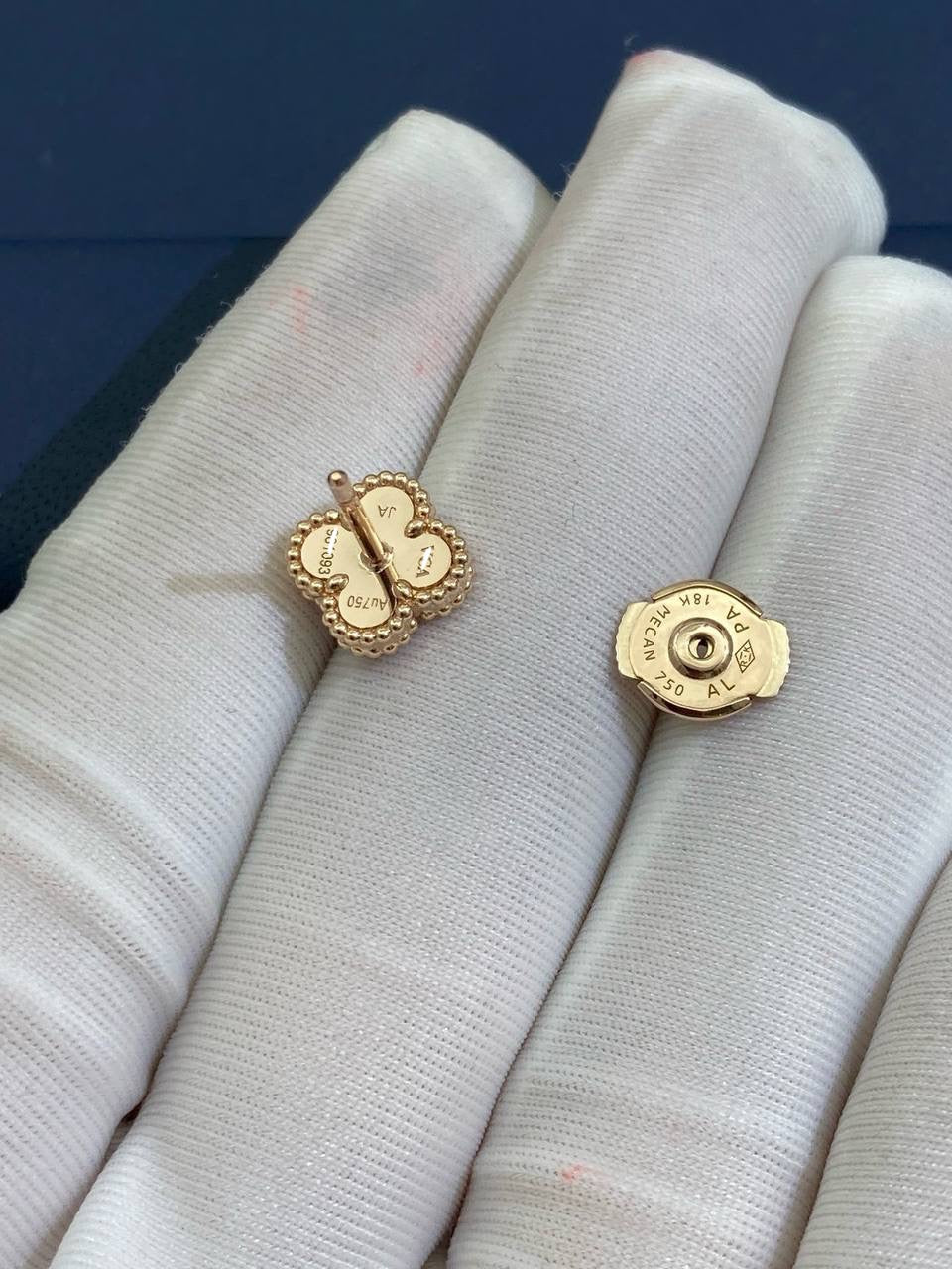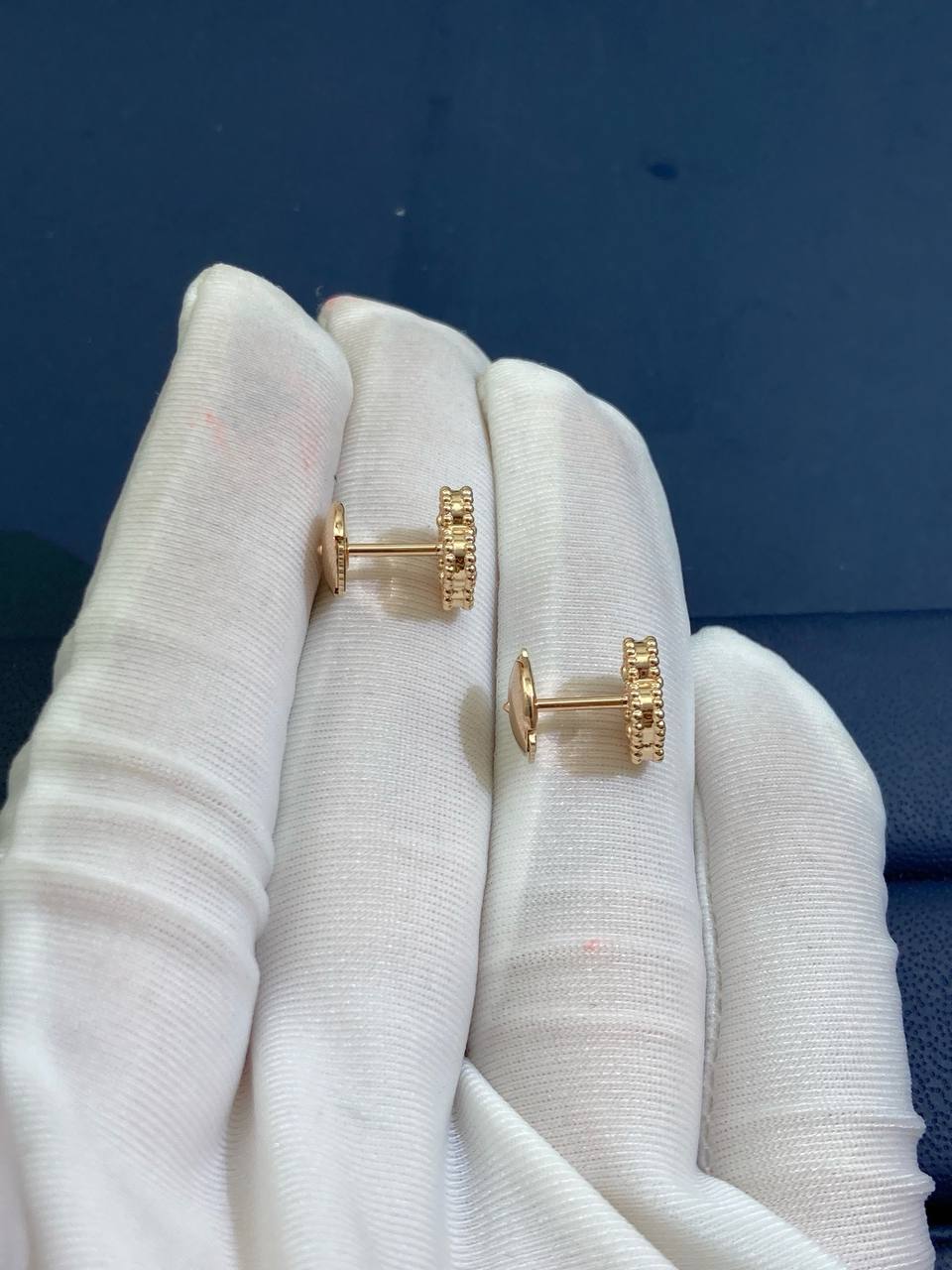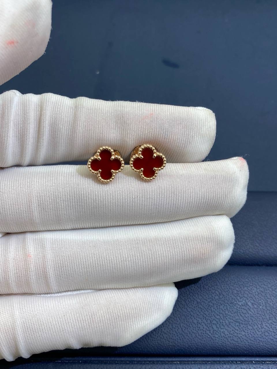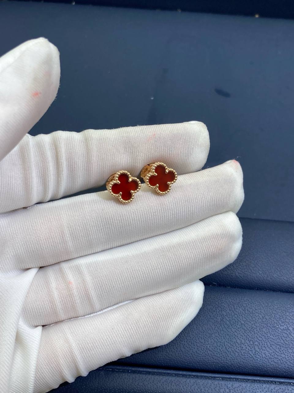 An iconic pair of 18k rose gold earrings, designed with the timeless four-leaf clover motif symbolizing luck and elegance. Each earring is edged with delicate beading and set with a vibrant carnelian inlay, its rich reddish-orange hue glowing beautifully against the warmth of rose gold. A piece that radiates both sophistication and charm.