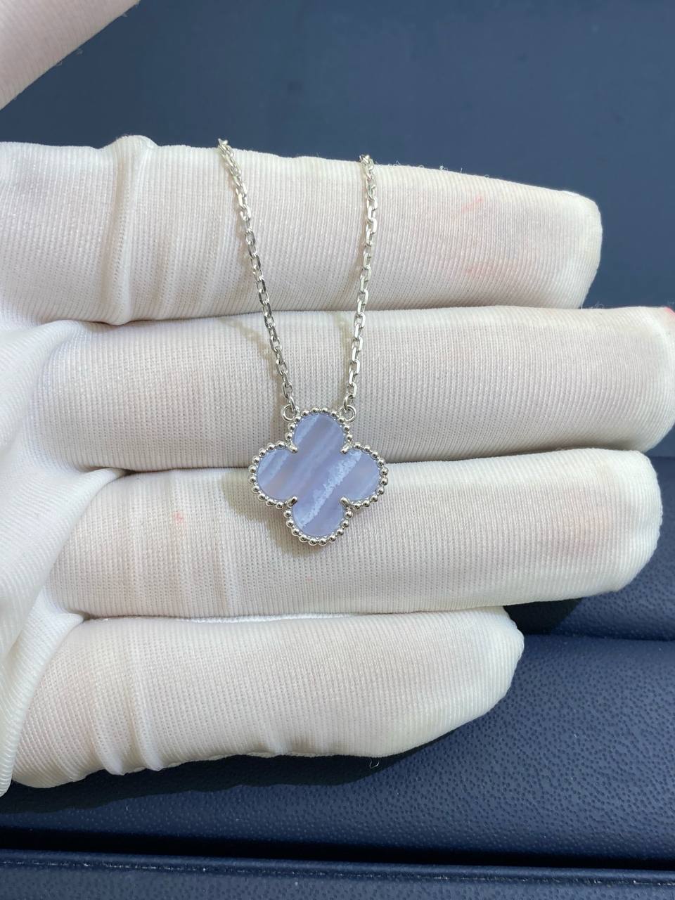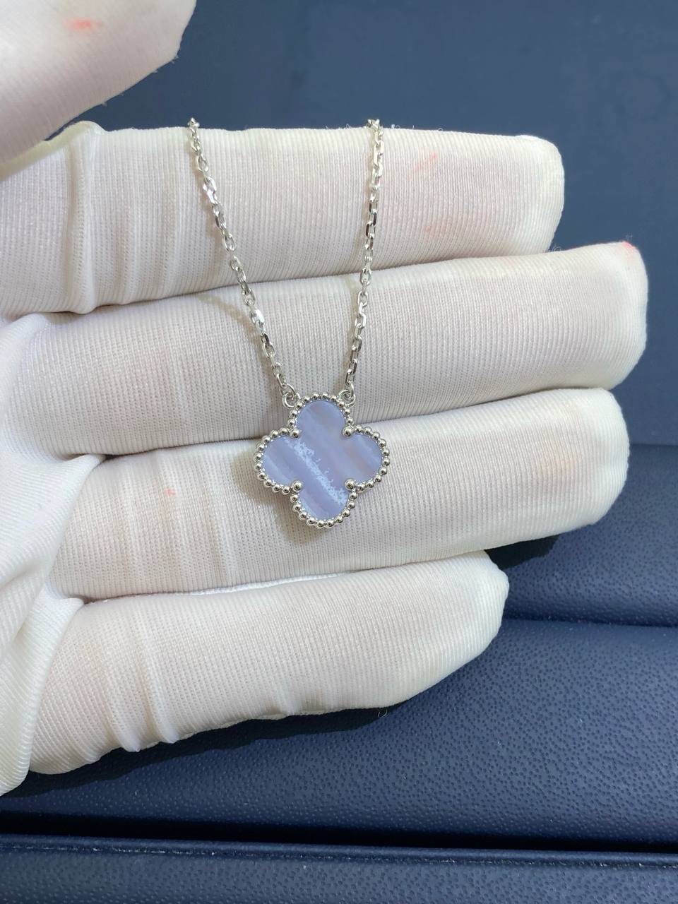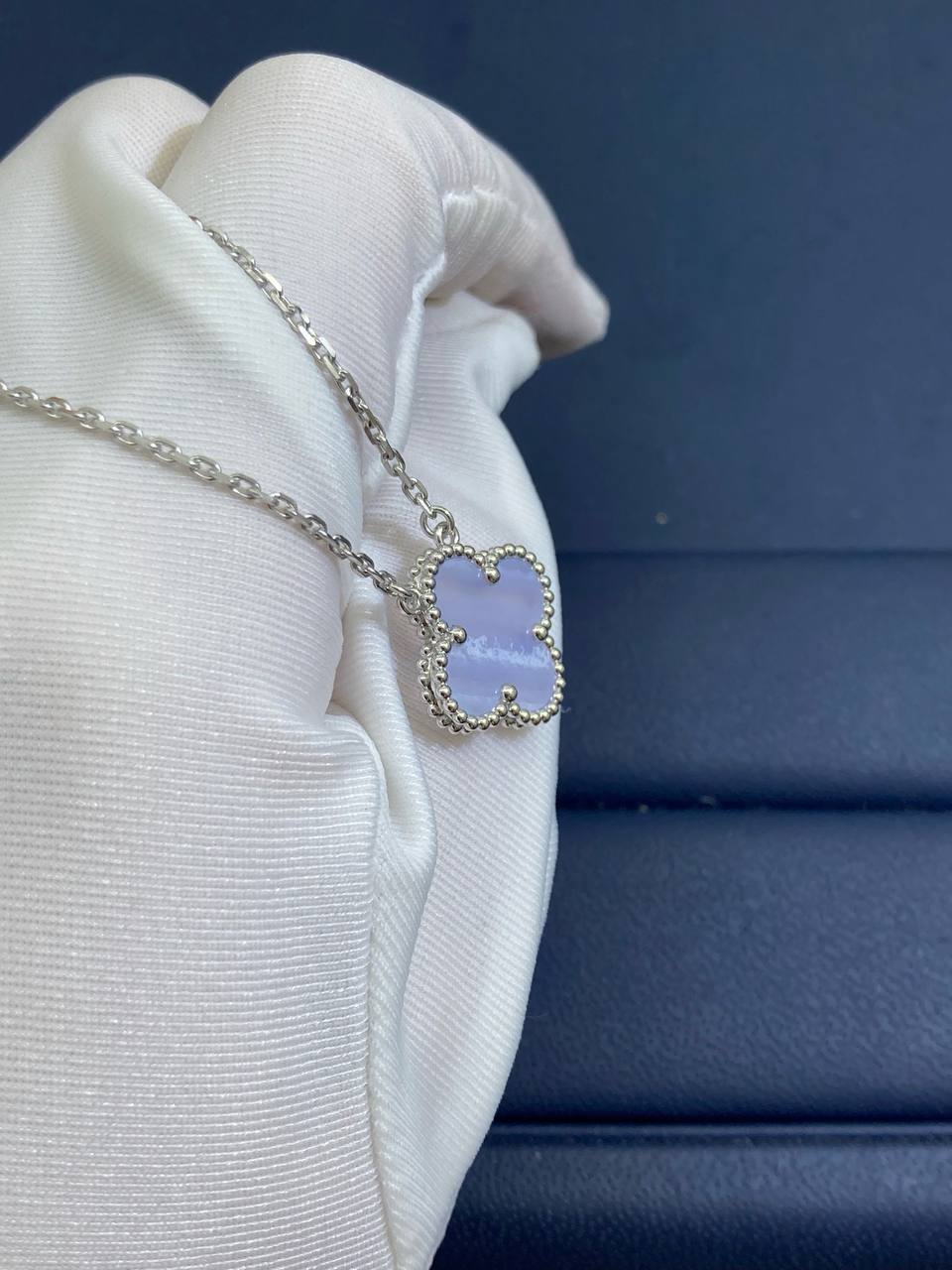 This refined collar-length necklace is crafted in 18k white gold and features a single clover pendant inlaid with soft, luminous chalcedony. Finished with a hallmark clasp, the design exudes timeless elegance and versatile charm, making it perfect for both everyday wear and special occasions.