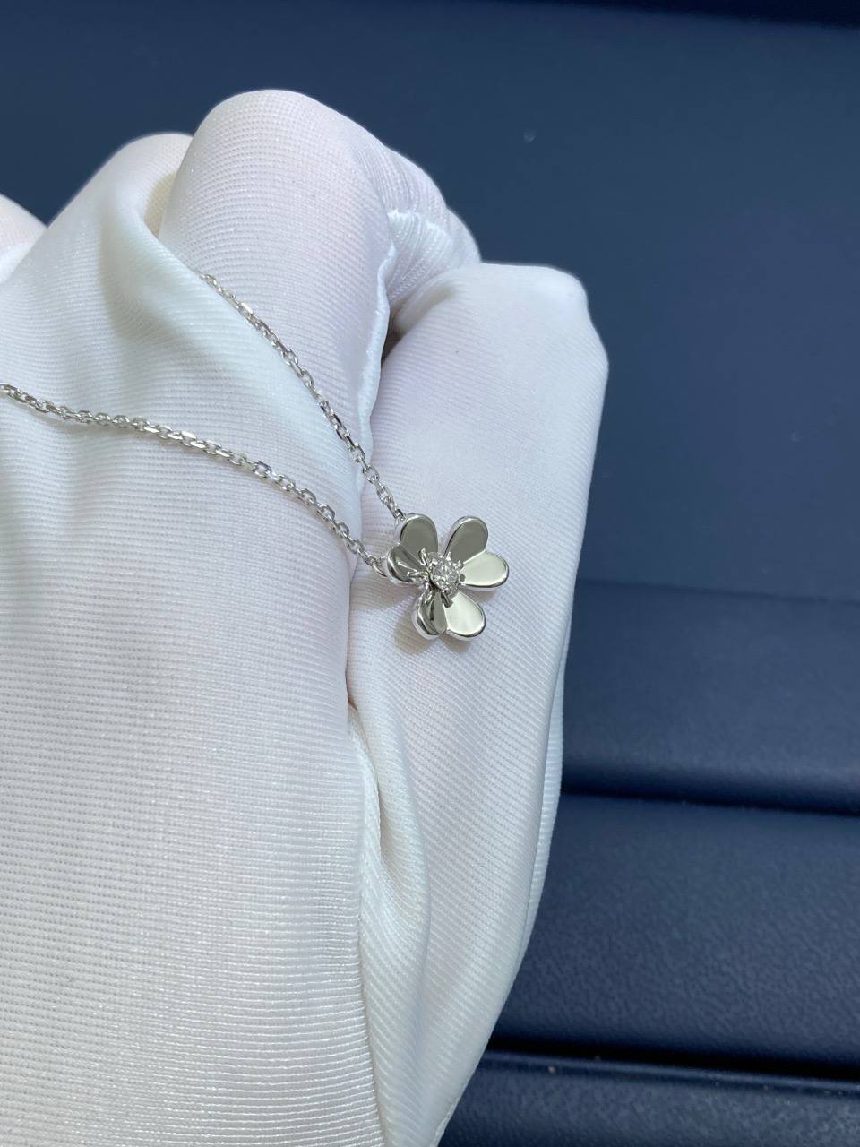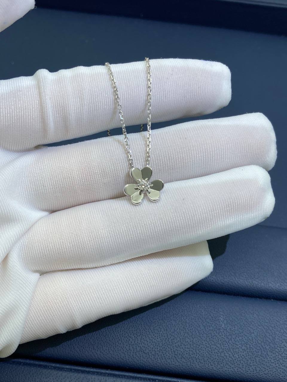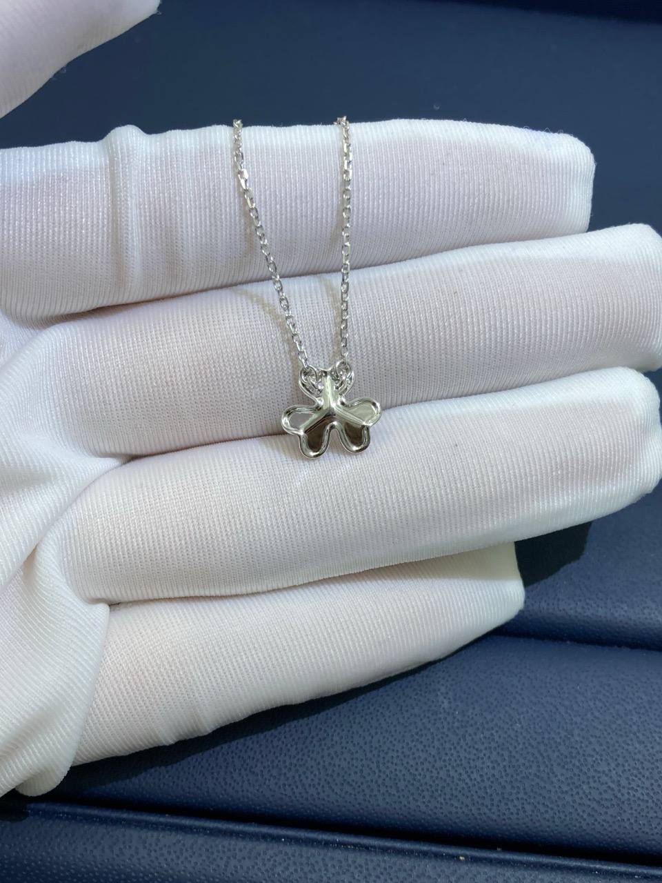 Elegant and timeless, this pendant is crafted in 18K white gold and shaped into a delicate three-petaled flower. At its center rests a brilliant-cut diamond weighing 0.05 carats, radiating pure sophistication and light. Suspended from a fine chain, this graceful design transitions effortlessly from day to evening, making it a cherished addition to any collection.