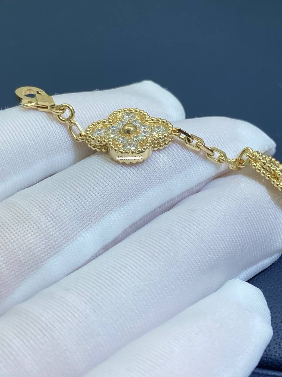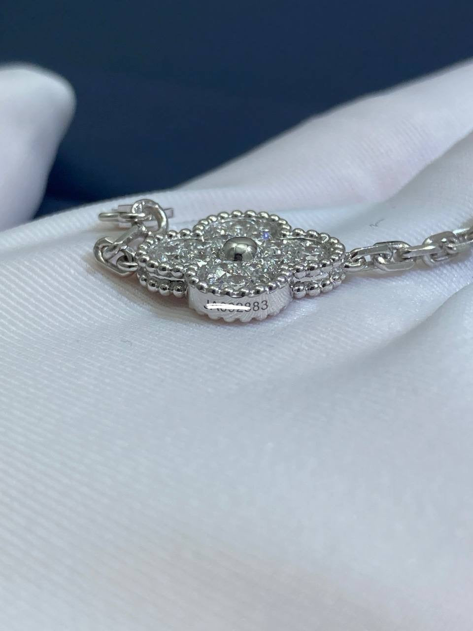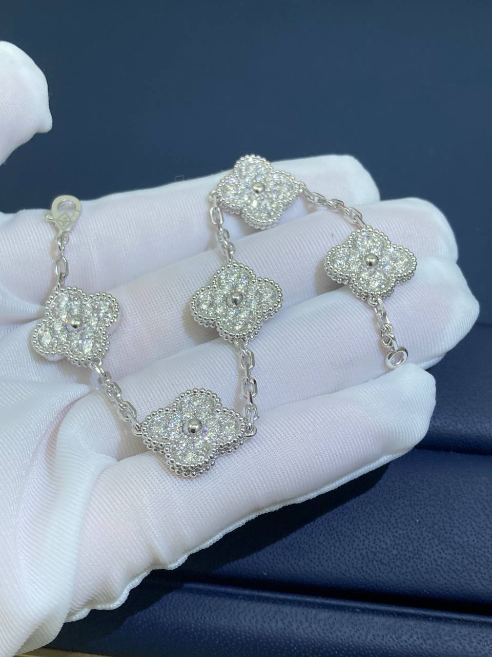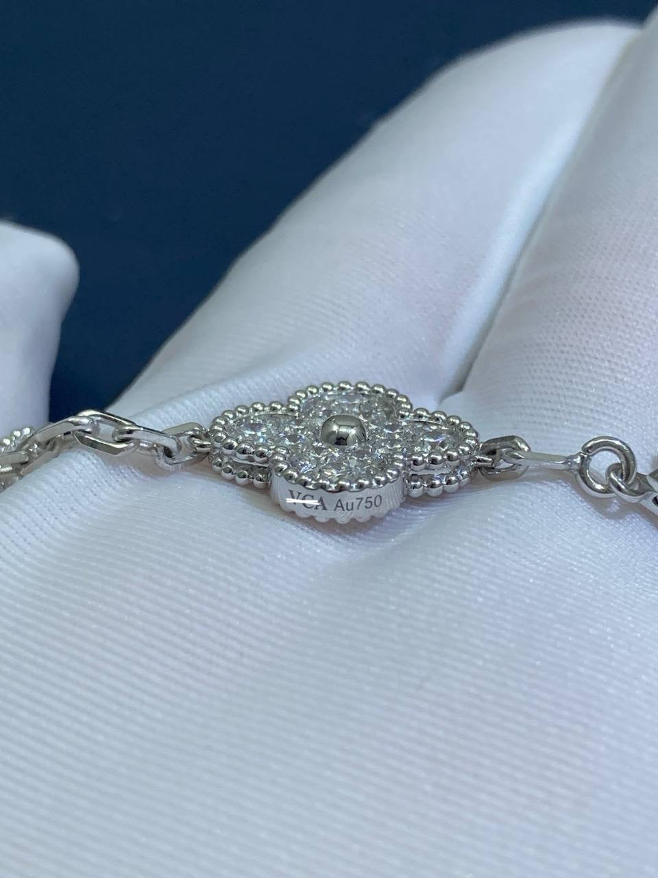 A timeless symbol of luck and elegance, this exquisite bracelet is crafted in 18K white gold and adorned with five iconic clover motifs. Each motif is intricately set with pavé diamonds, creating a dazzling play of light with every movement. Sophisticated and versatile, it makes a radiant addition to any fine jewelry collection.