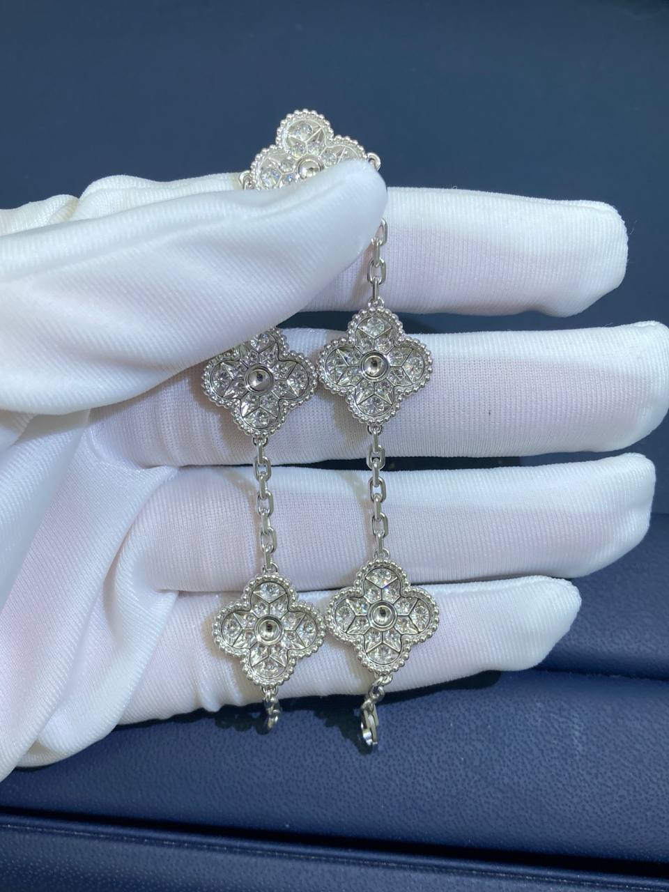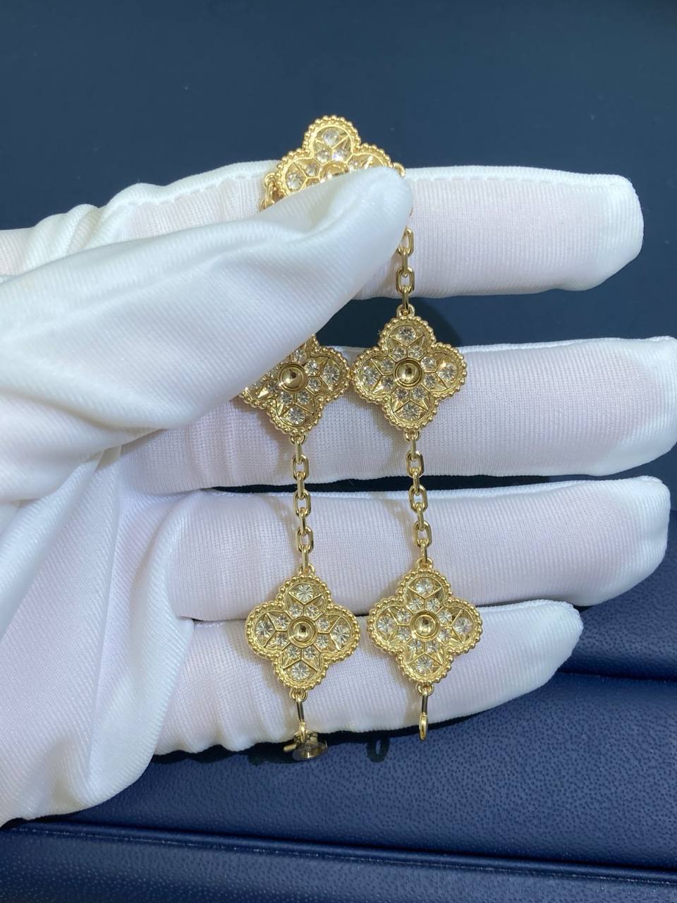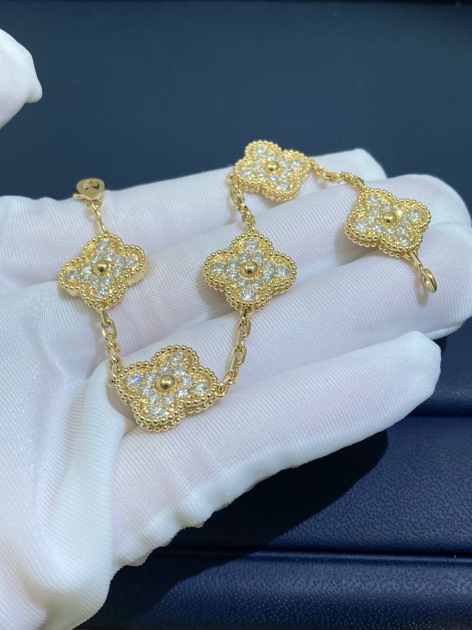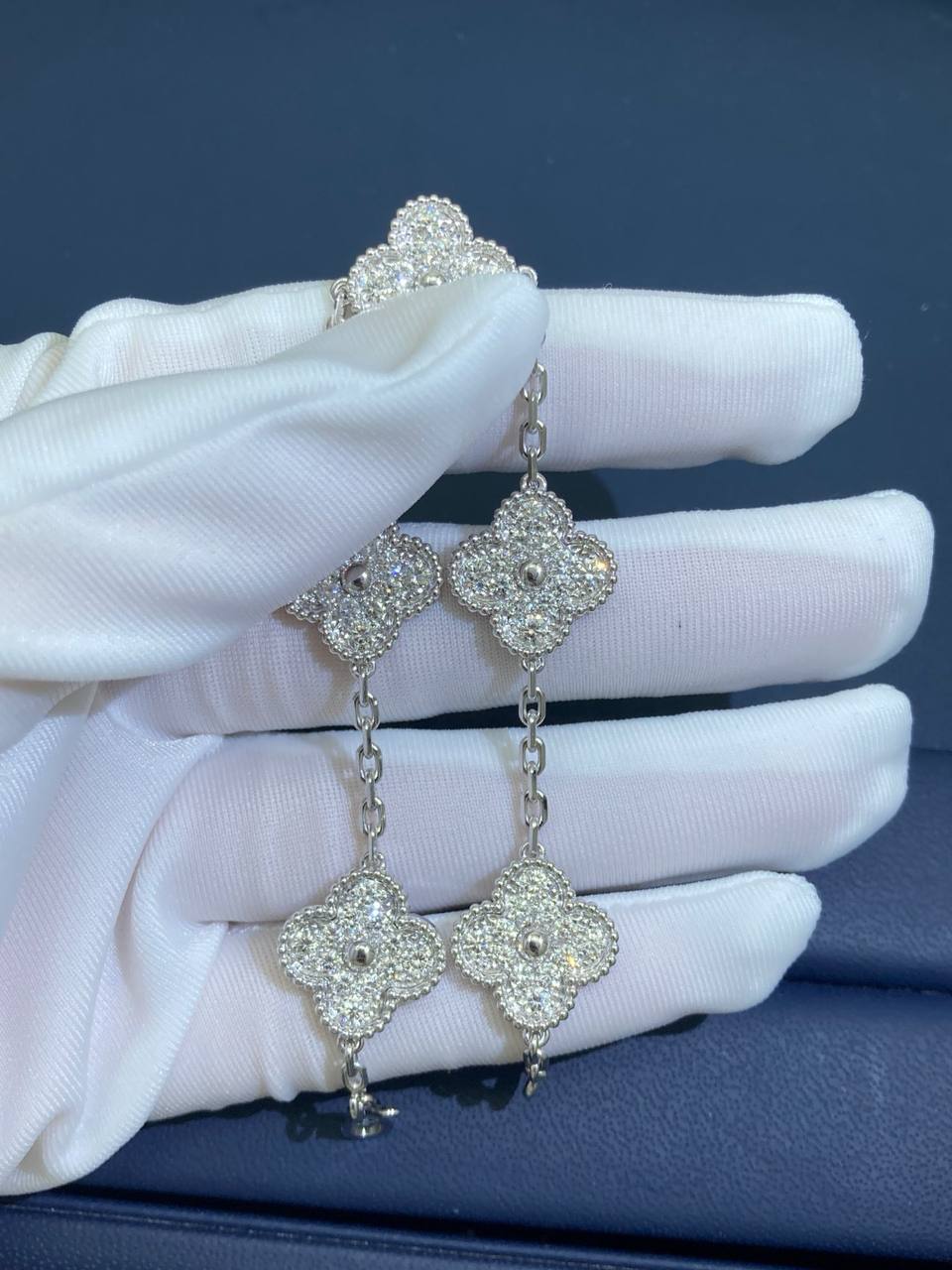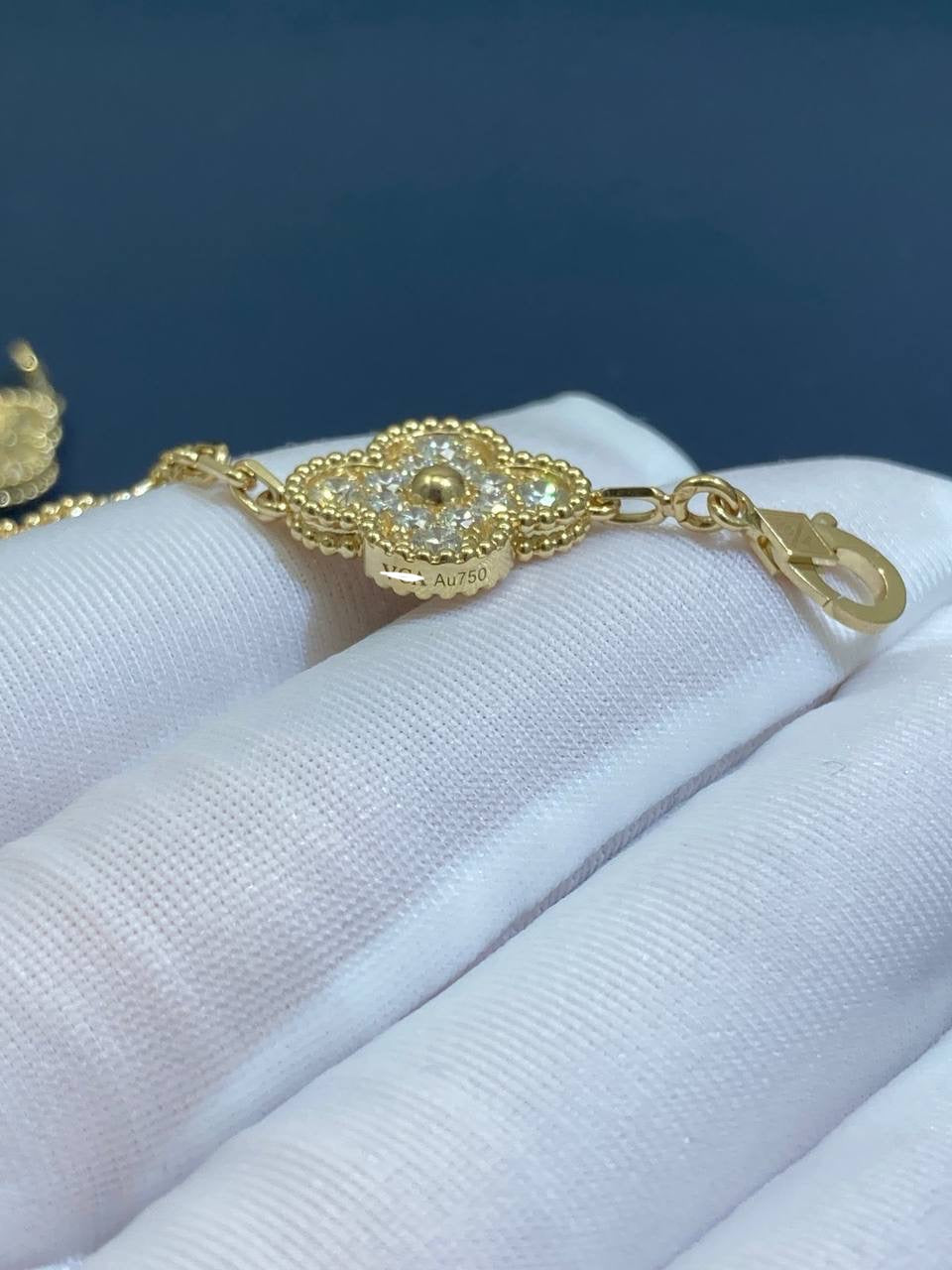 A timeless symbol of luck and elegance, this exquisite bracelet is crafted in 18K white gold and adorned with five iconic clover motifs. Each motif is intricately set with pavé diamonds, creating a dazzling play of light with every movement. Sophisticated and versatile, it makes a radiant addition to any fine jewelry collection.