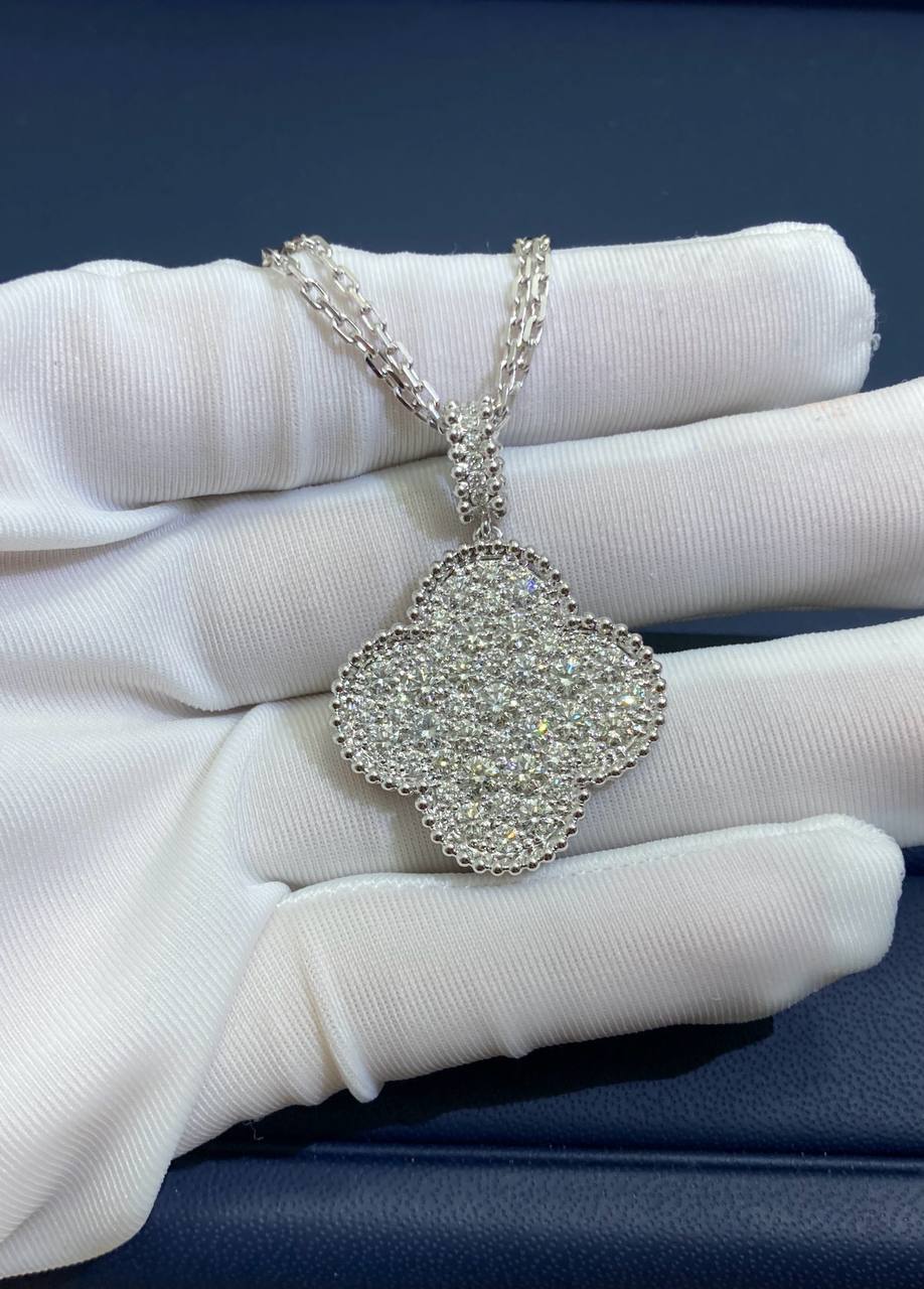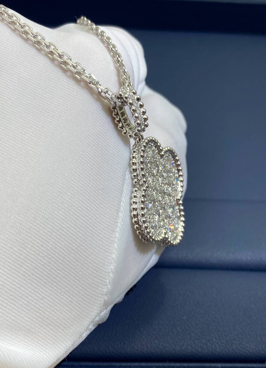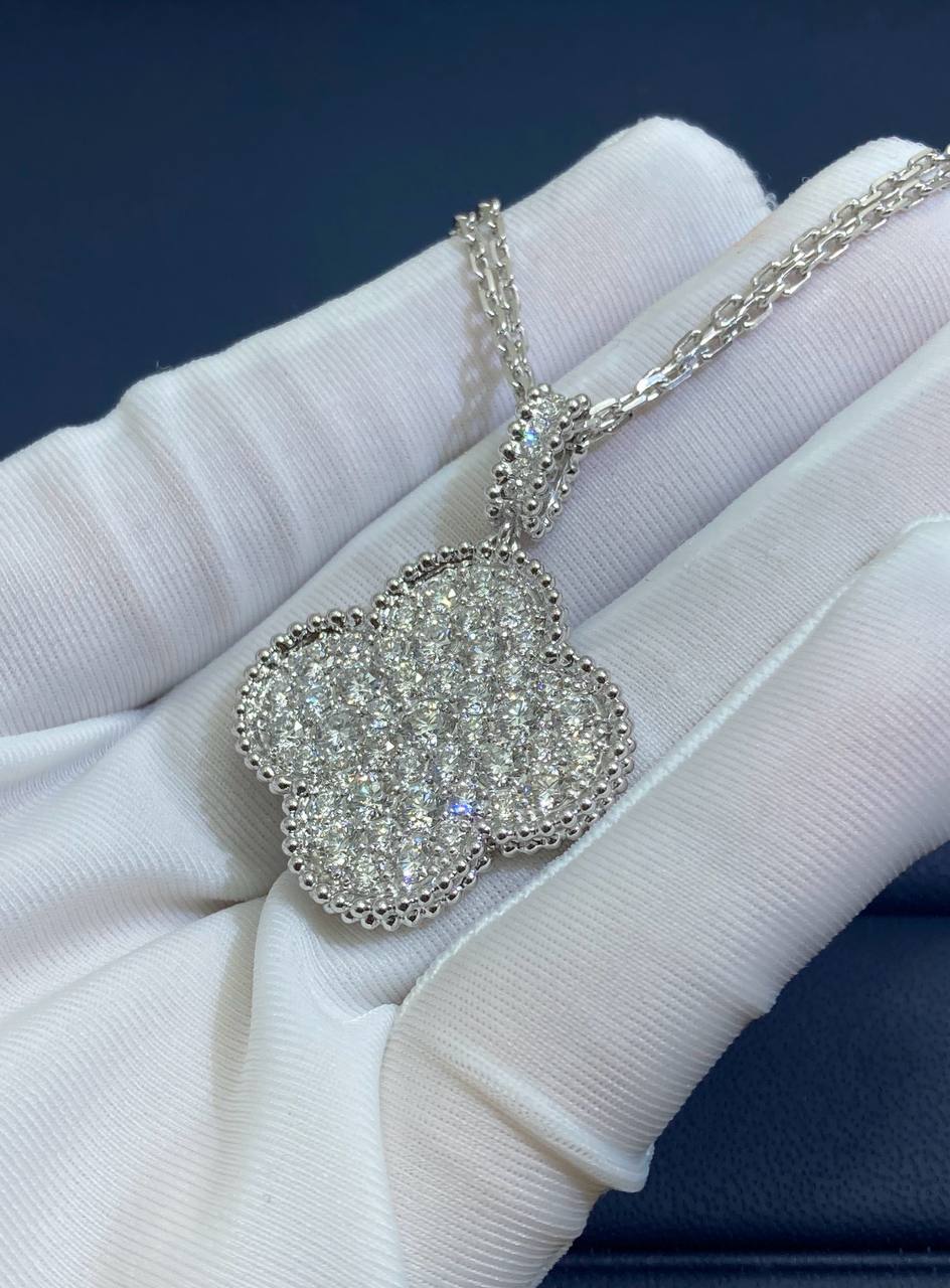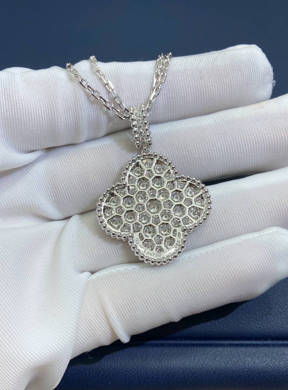 This magnificent pendant is crafted in 18K solid white gold and features 45 exceptional round brilliant-cut diamonds, totaling 2.45 carats, beautifully pavé-set for maximum sparkle. Designed in a large, eye-catching size, the motif measures 26mm by 26mm and hangs gracefully from a 42cm adjustable chain, finished with a secure hallmark clasp.