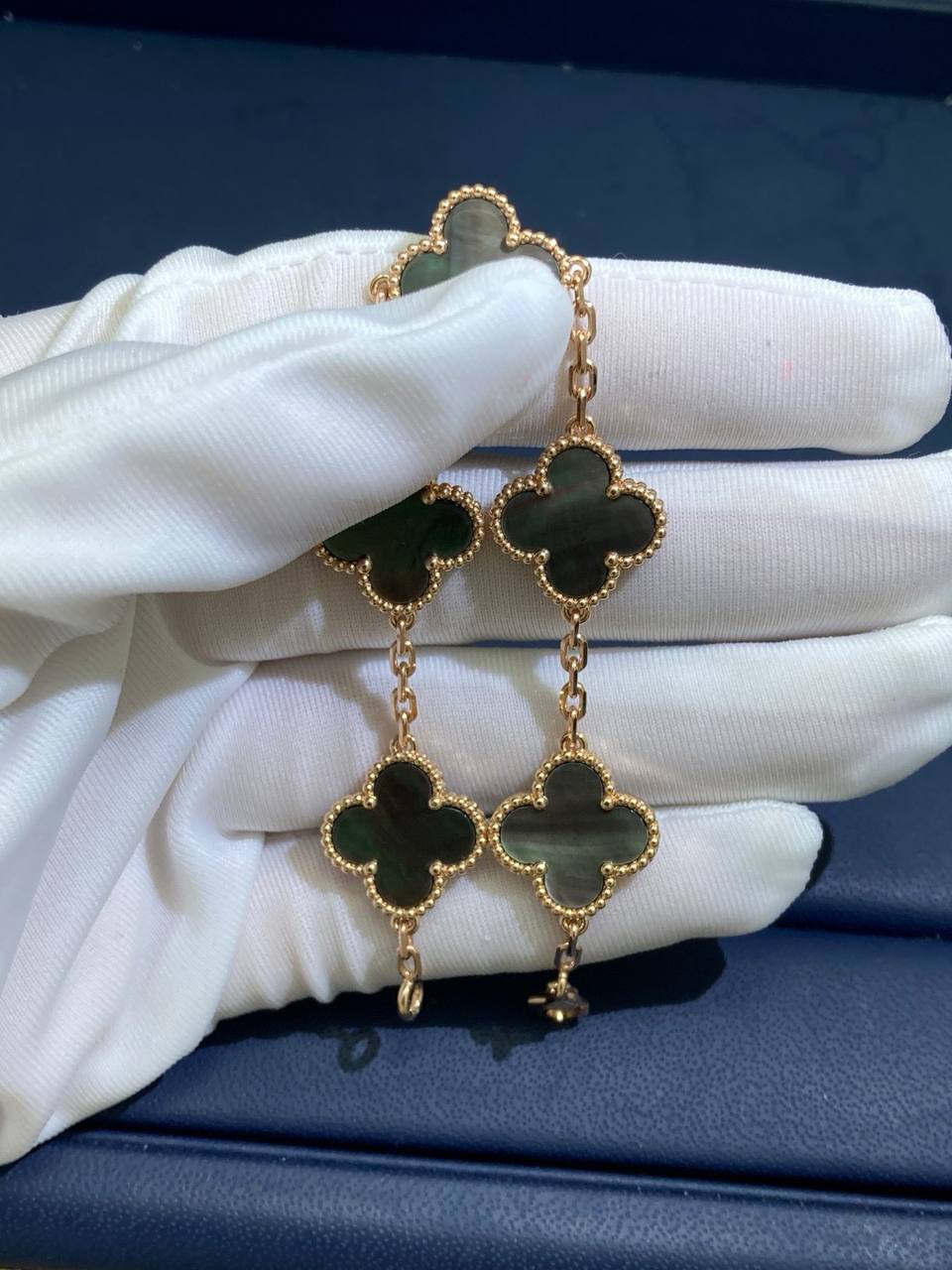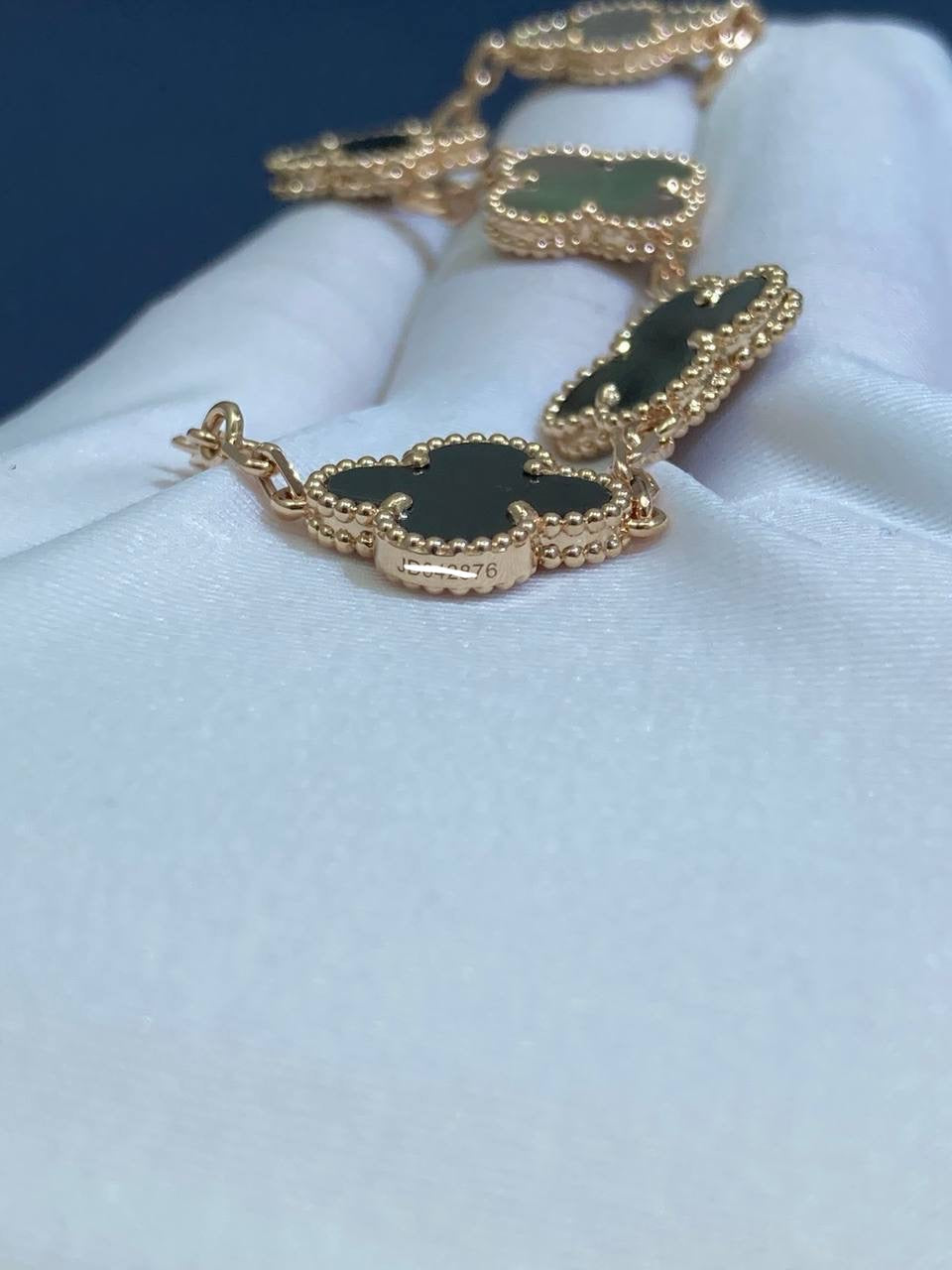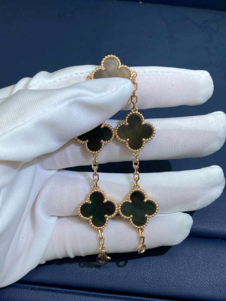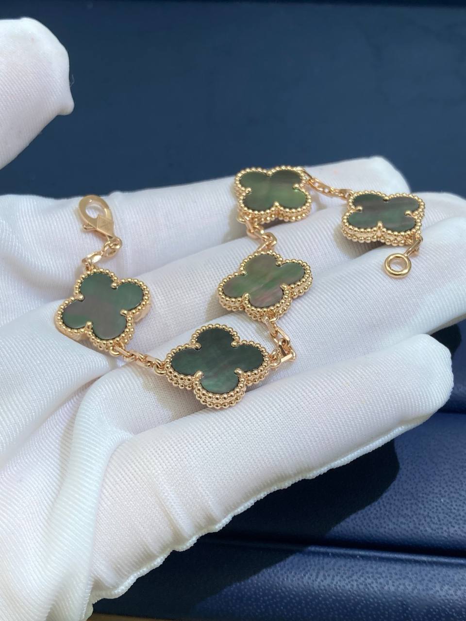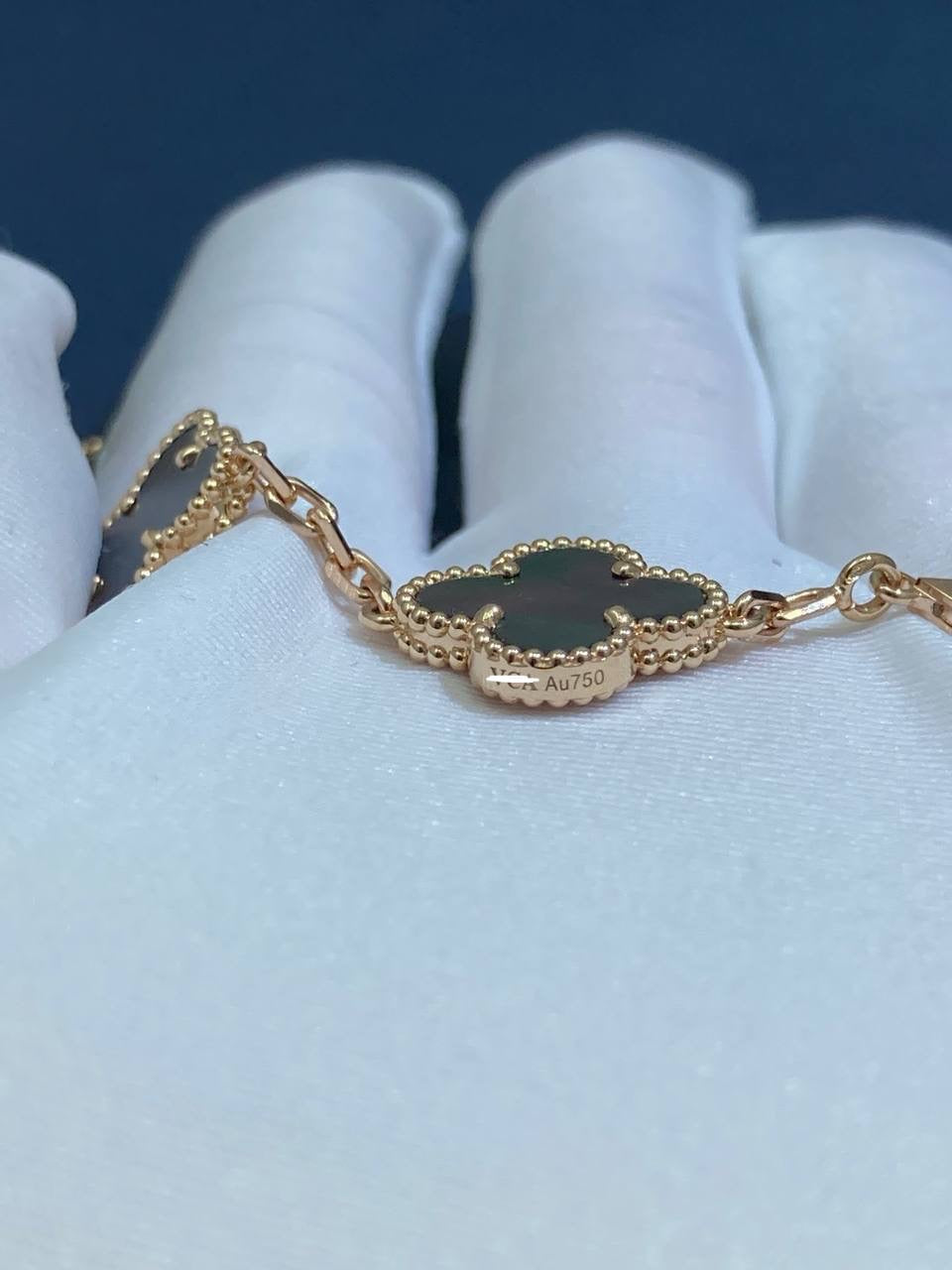 A timeless expression of elegance, this exquisite bracelet is crafted in 18K rose gold and adorned with five signature clover motifs. Each motif is inlaid with shimmering grey mother-of-pearl, framed by a delicate beaded edge that symbolizes luck and sophistication. Suspended from a fine gold chain with a secure lobster clasp, it’s a versatile piece designed for both everyday refinement and special occasions.
