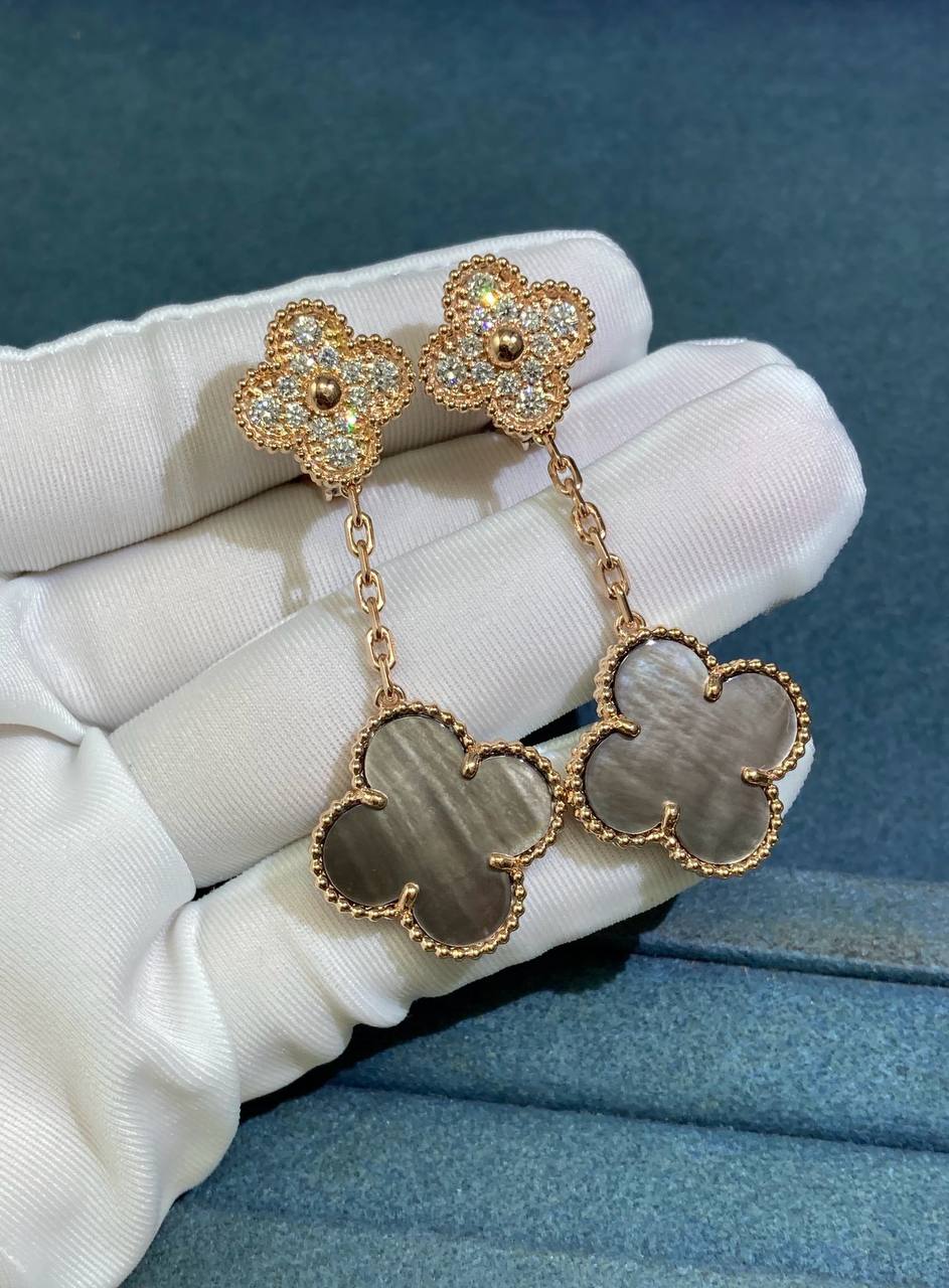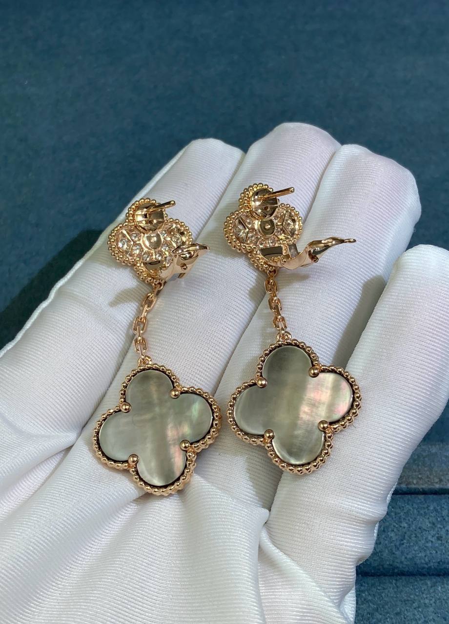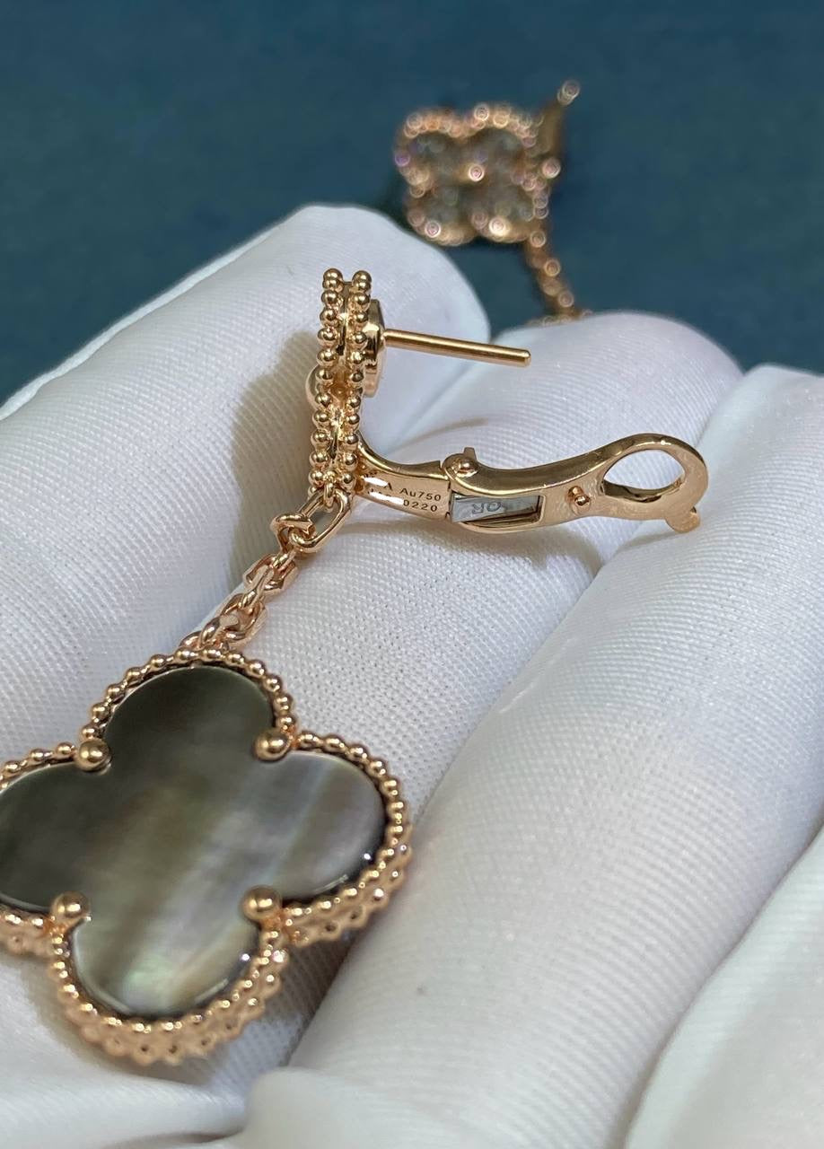 These exquisite earrings are crafted in 18k rose gold and designed with a double four-leaf clover motif. The upper motif sparkles with pavé-set round brilliant-cut diamonds, while the lower motif is inlaid with luminous grey mother-of-pearl, both framed by delicate beaded edging. Together, the 24 diamonds total 0.97 carats, adding radiant brilliance to the design. The earrings are finished with post and lever-hinged fittings, offering both elegance and comfort in wear.