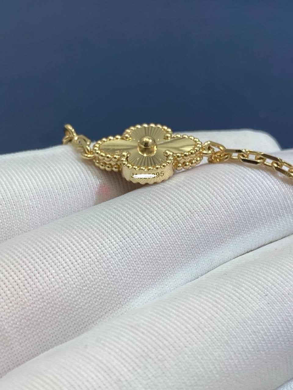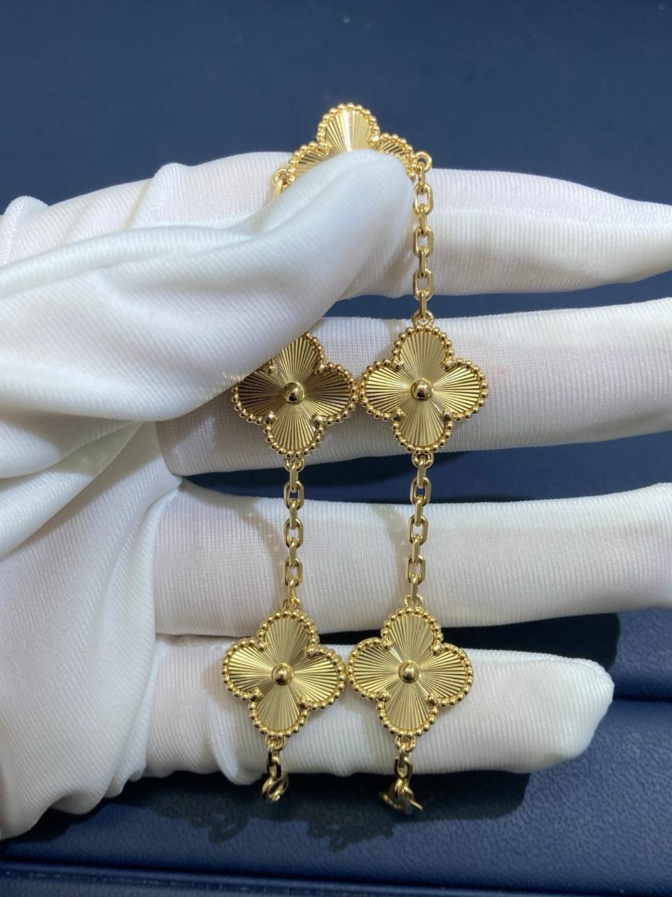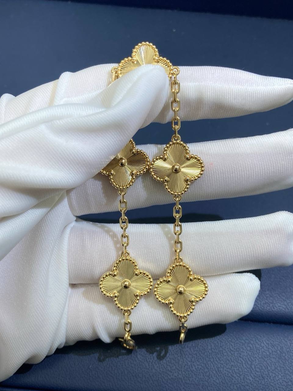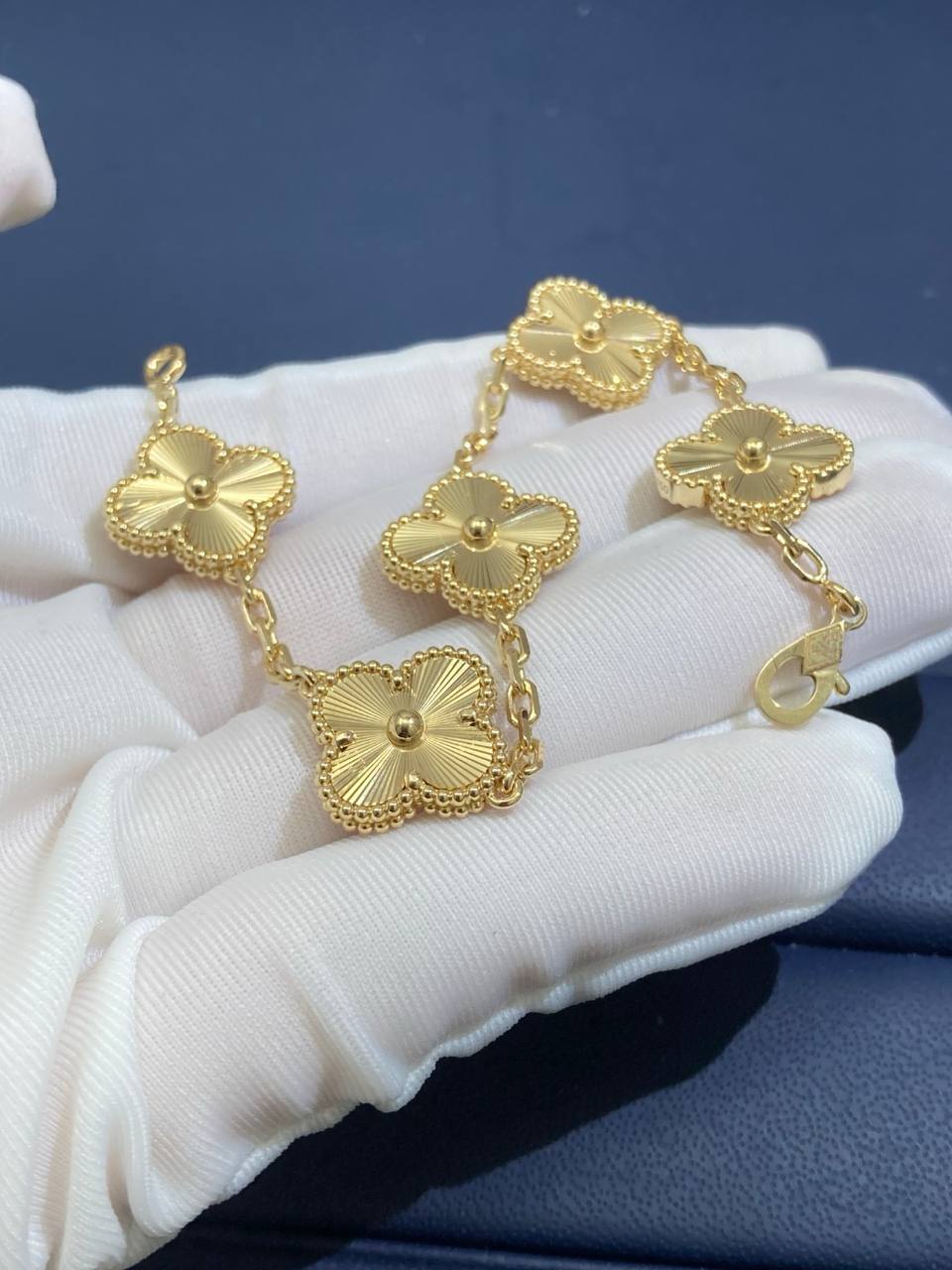 This bold yet elegant bracelet is exquisitely crafted in 18K gold, showcasing five clover motifs adorned with a radiant Guilloché texture. A refined design that captures both timeless style and contemporary elegance.