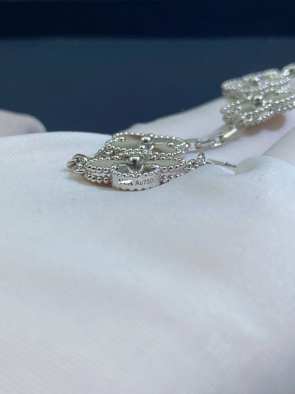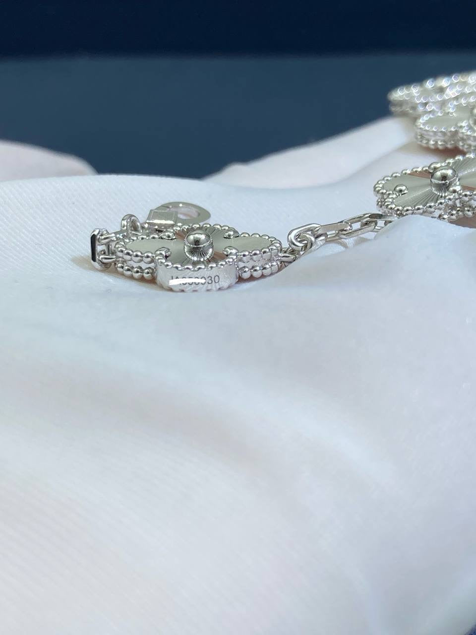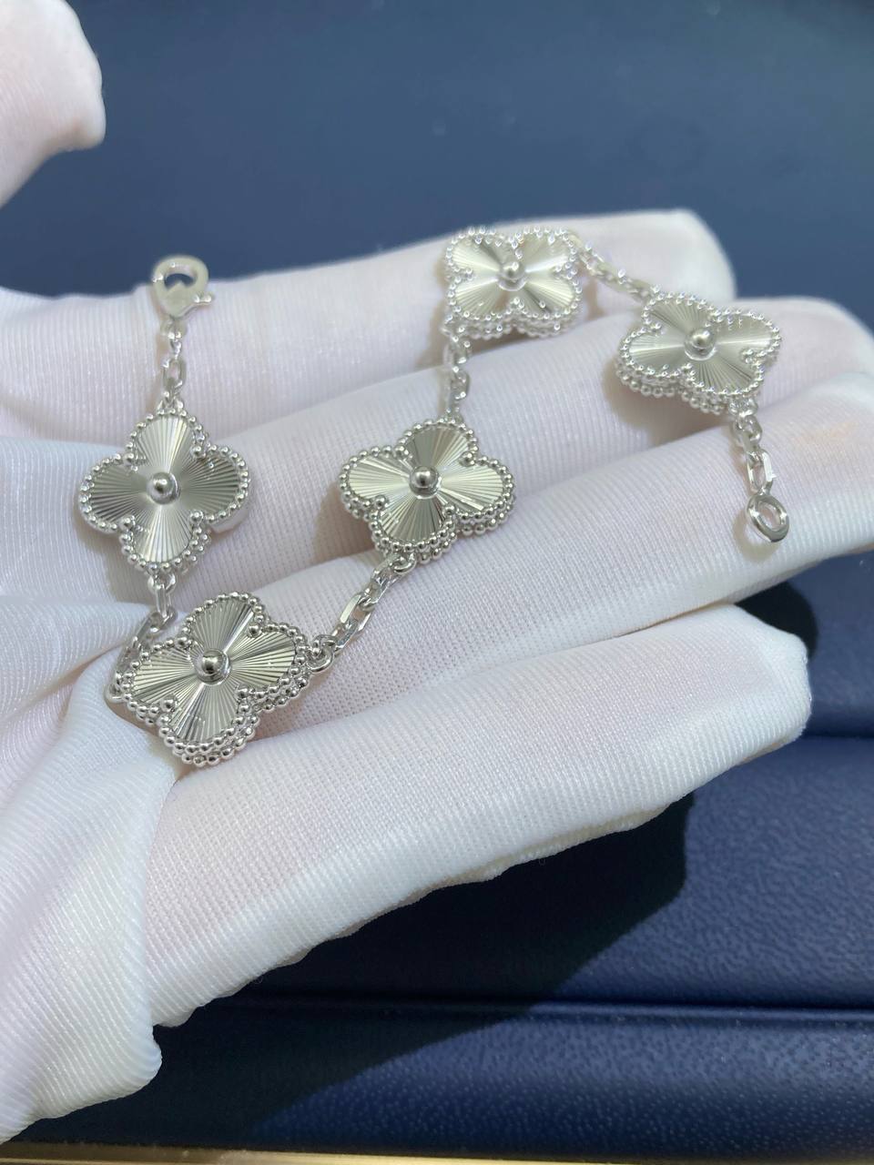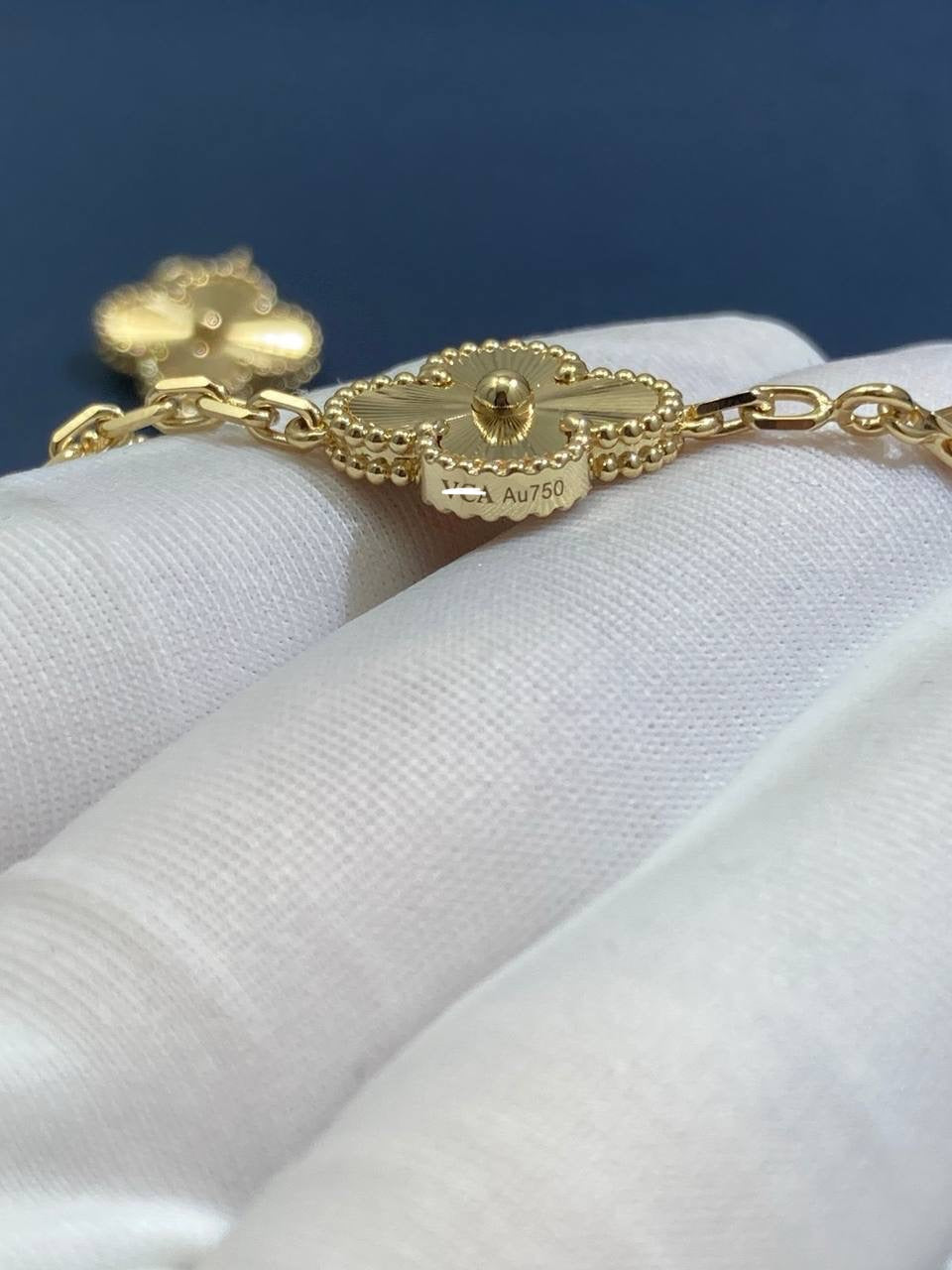 This bold yet elegant bracelet is exquisitely crafted in 18K gold, showcasing five clover motifs adorned with a radiant Guilloché texture. A refined design that captures both timeless style and contemporary elegance.