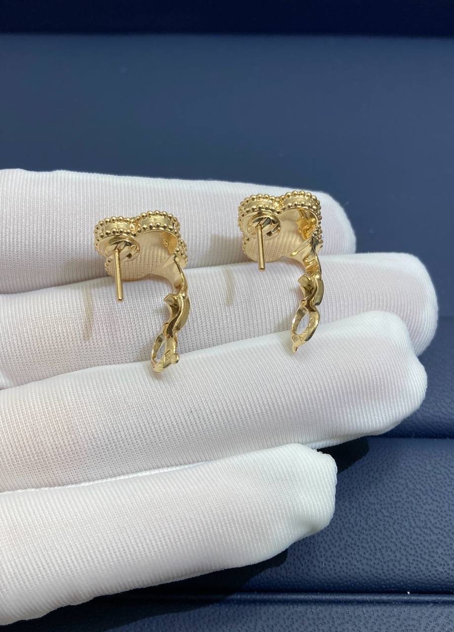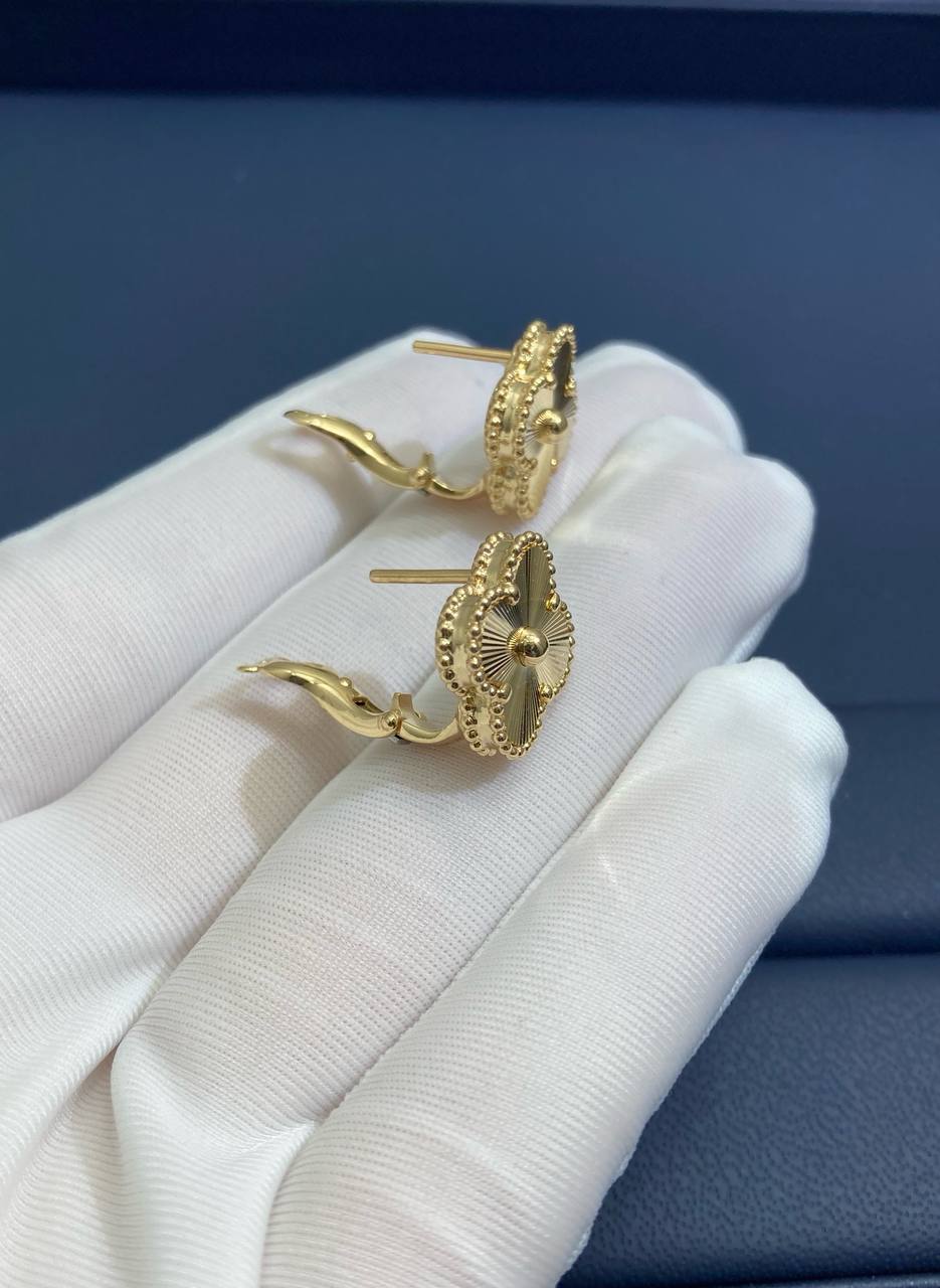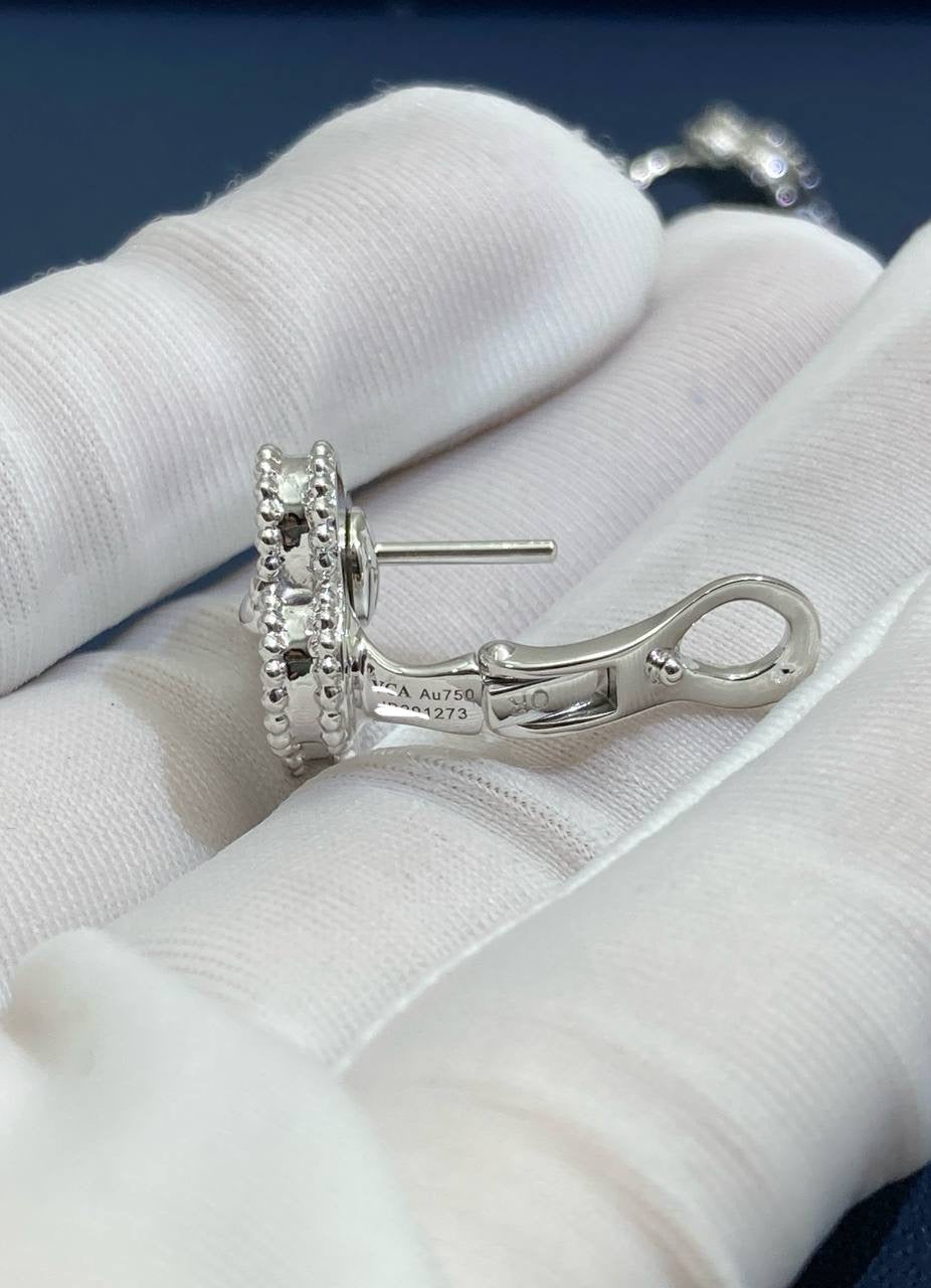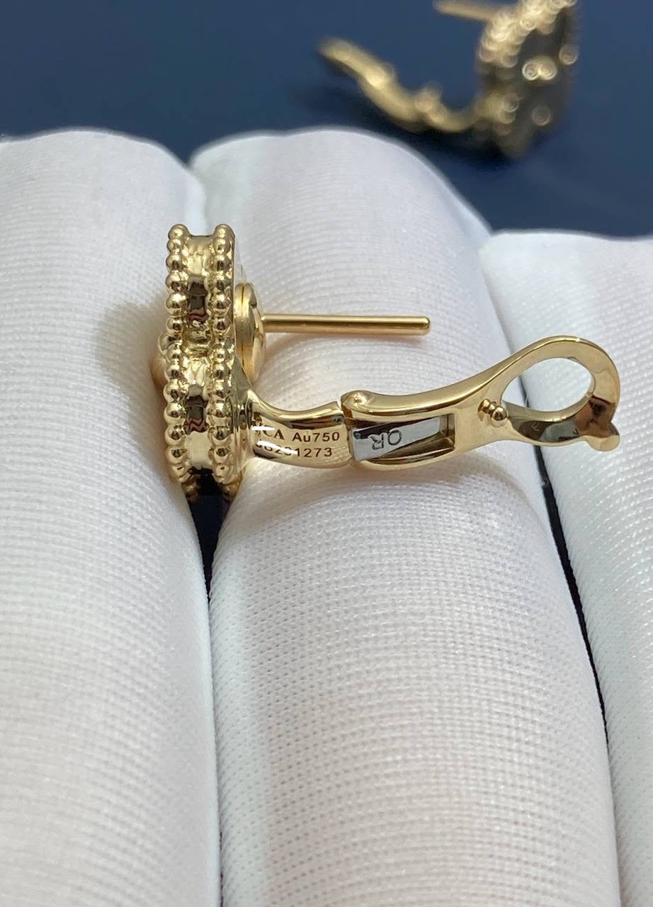 These stunning earrings exude timeless elegance and refined craftsmanship. Inspired by the iconic clover leaf, a symbol of luck, each motif is beautifully framed with a delicate border of golden beads, highlighting its graceful symmetry and sophistication. Available in 18k yellow or white gold, they make a versatile and luxurious addition to any jewelry collection.