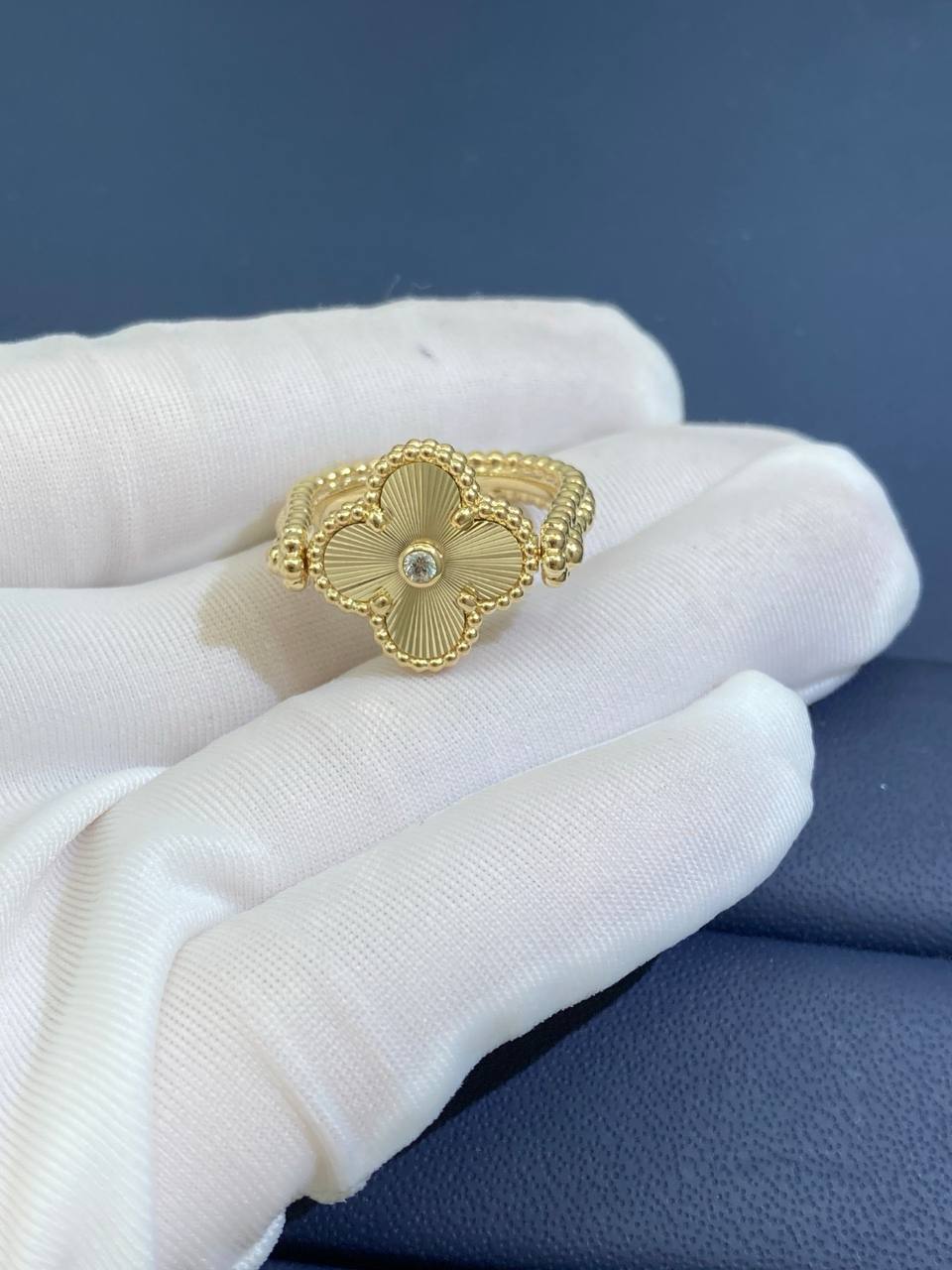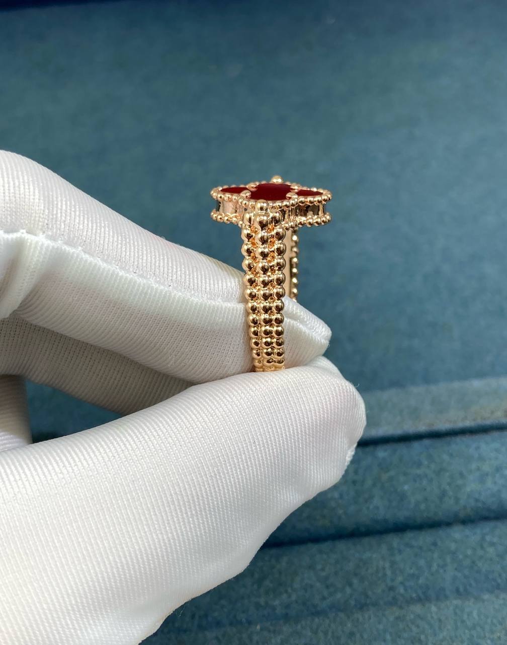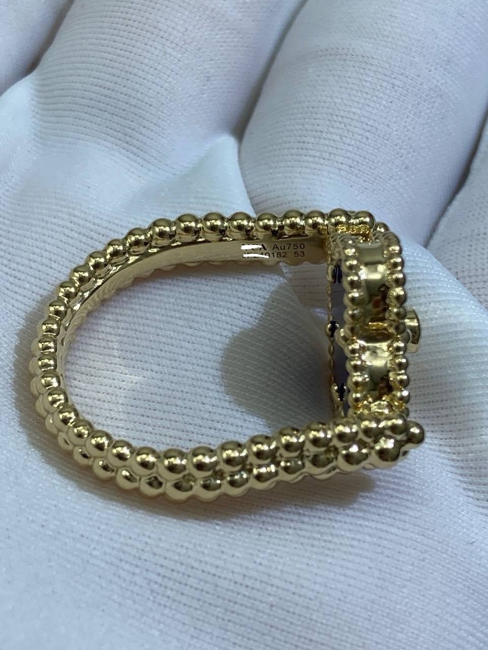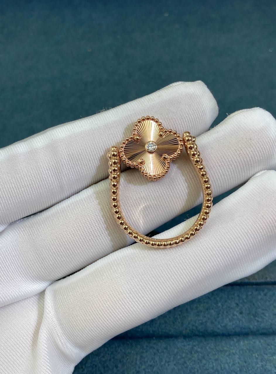 This reversible 18K gold ring offers three looks in one. Crafted in 18K rose gold with a deep red carnelian clover—or in yellow gold with agate—the design features a double row of beading on one side and rose gold guilloché on the other, with a bezel-set 0.05 CT diamond at the center. The triple row of gold beading along the shank adds texture and depth, making this piece versatile enough to wear as a ring or even as a pendant.