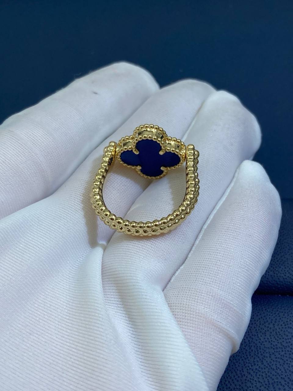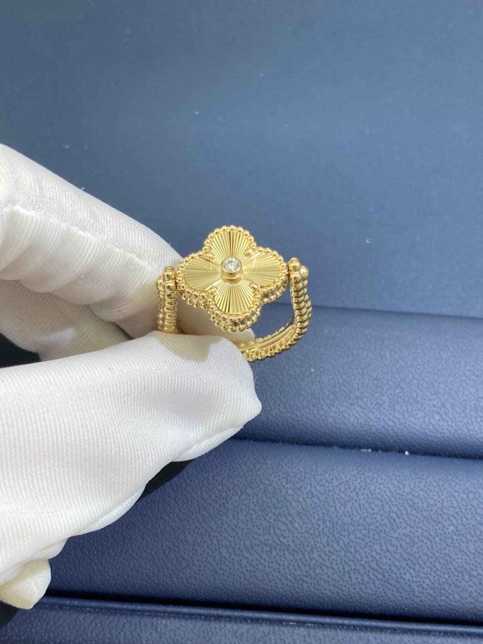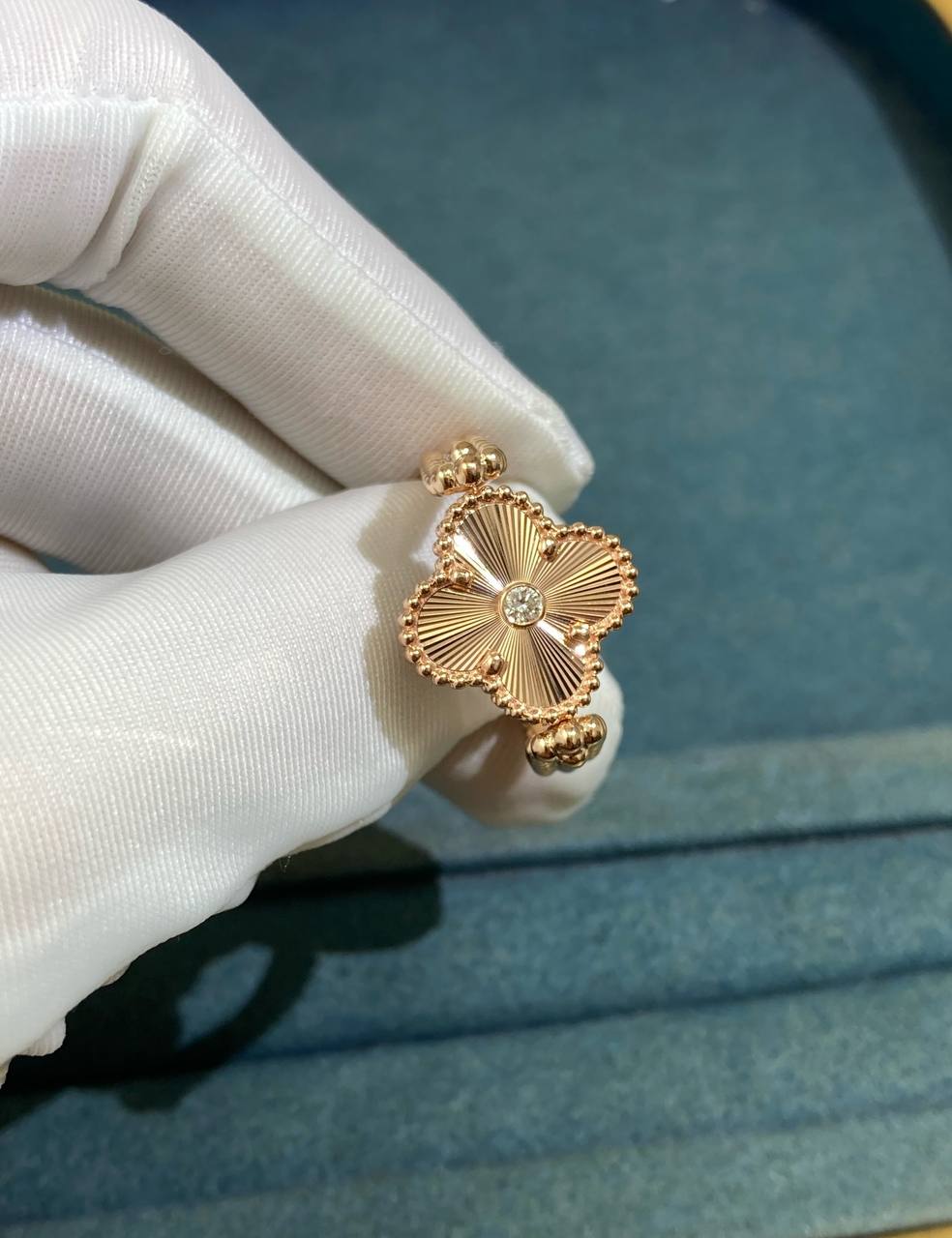 This reversible 18K gold ring offers three looks in one. Crafted in 18K rose gold with a deep red carnelian clover—or in yellow gold with agate—the design features a double row of beading on one side and rose gold guilloché on the other, with a bezel-set 0.05 CT diamond at the center. The triple row of gold beading along the shank adds texture and depth, making this piece versatile enough to wear as a ring or even as a pendant.
