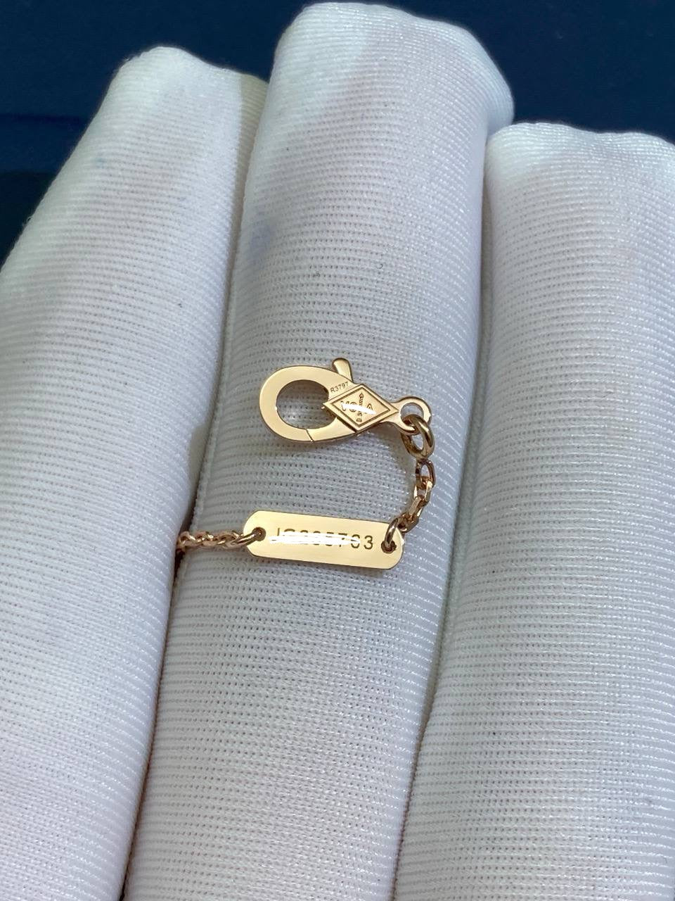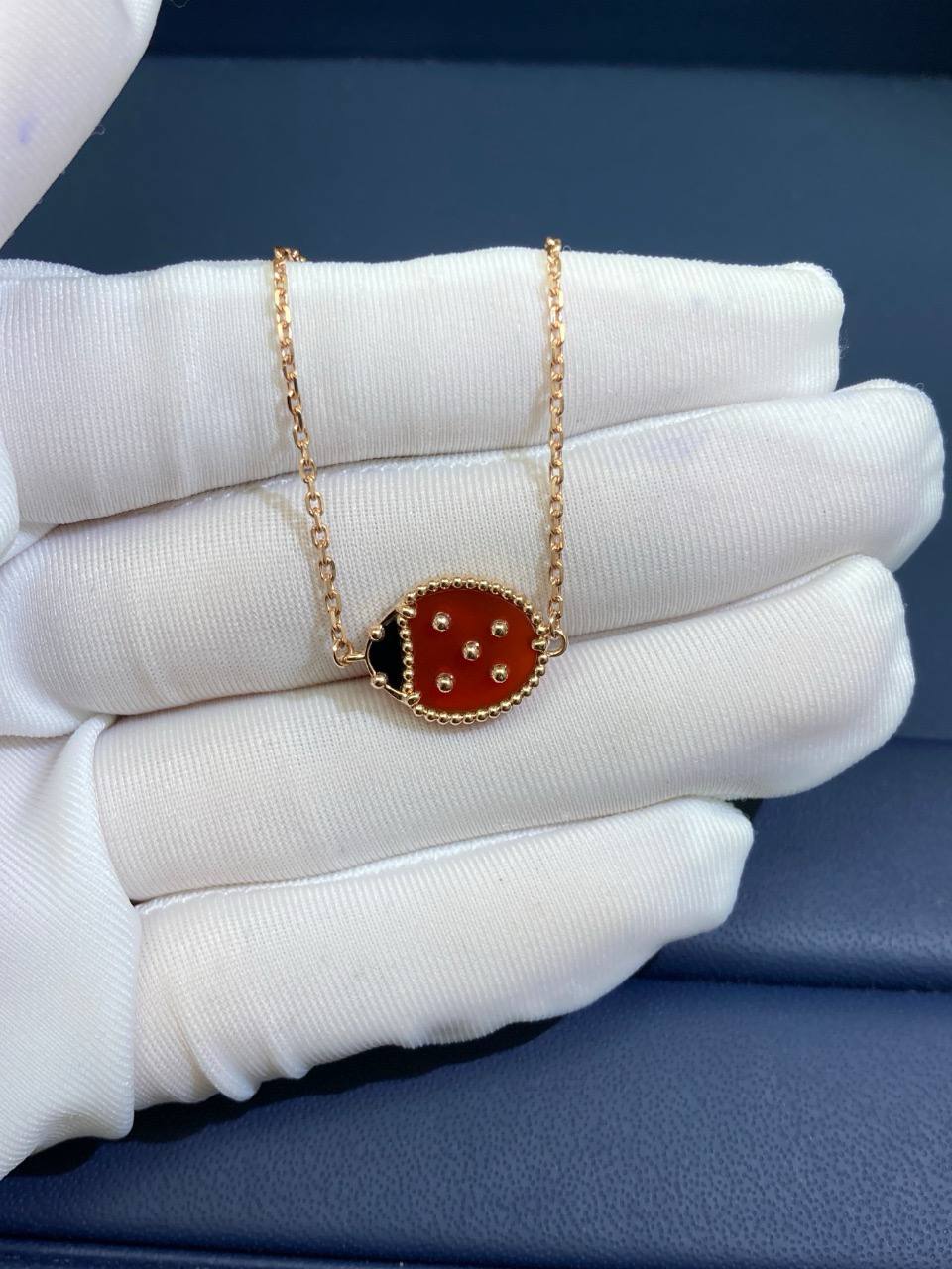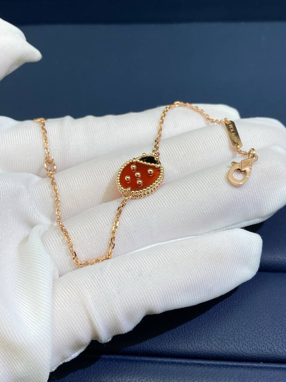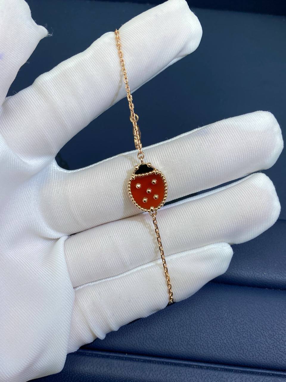 This charming Ladybug bracelet is crafted in 18k rose gold and showcases a delicate closed-wings ladybug motif, finely set with carved carnelian and onyx. Playful yet refined, it is suspended from an adjustable chain measuring 17 cm, secured with a hallmark clasp in rose gold. A whimsical jewel that brings both elegance and a touch of luck to everyday wear.