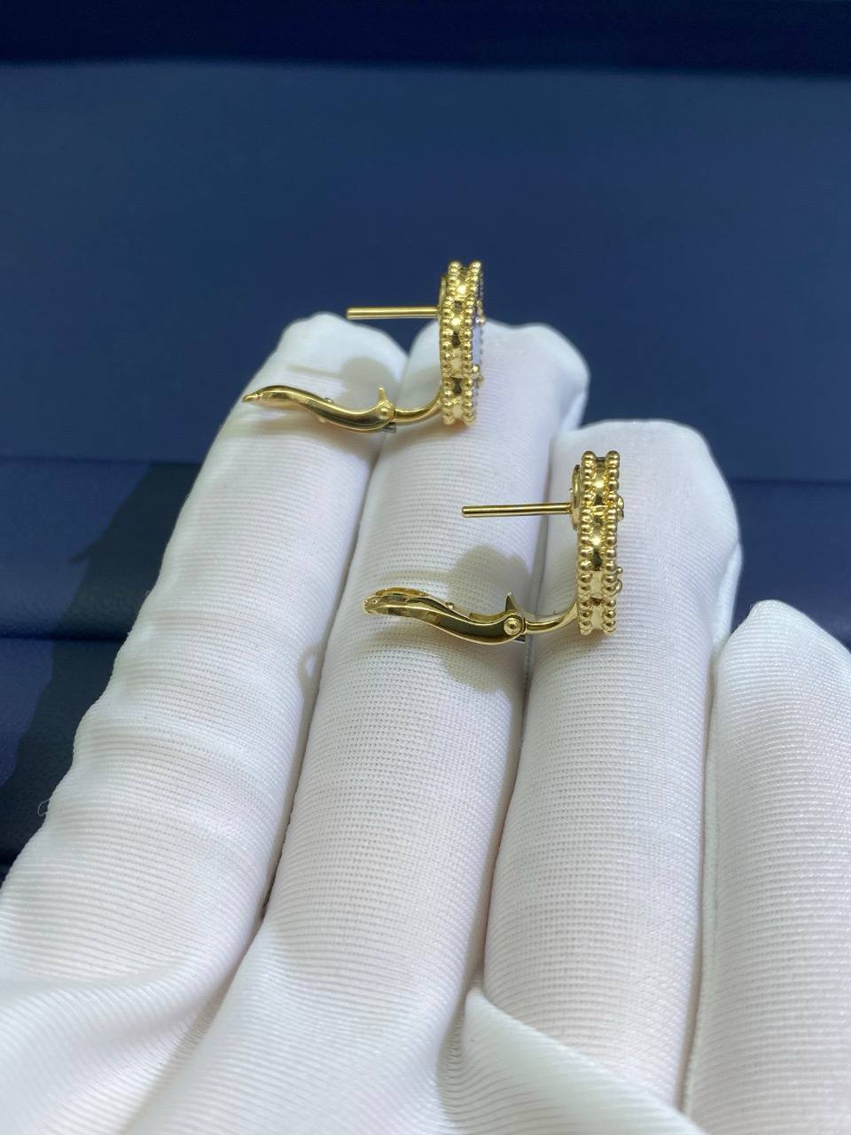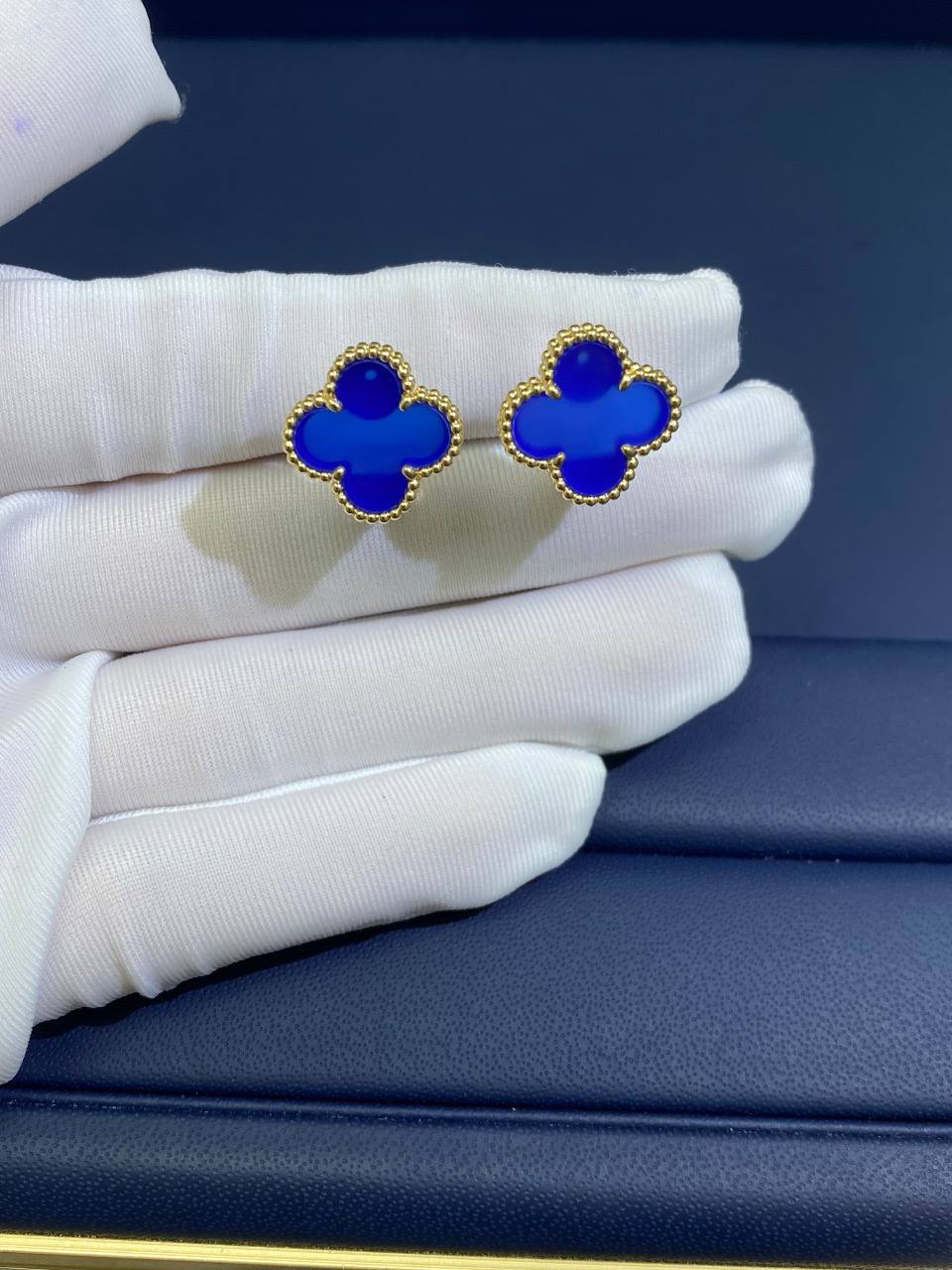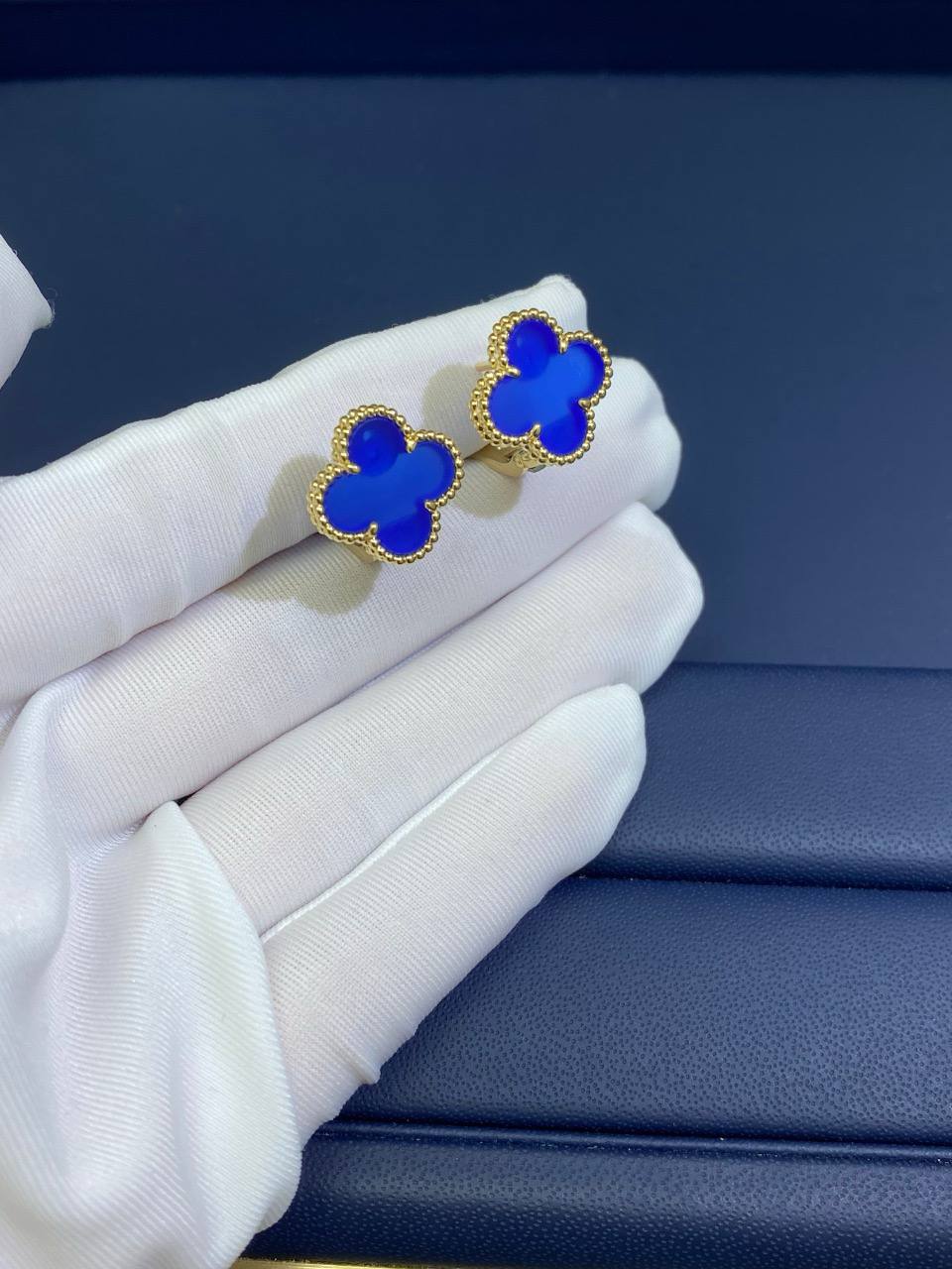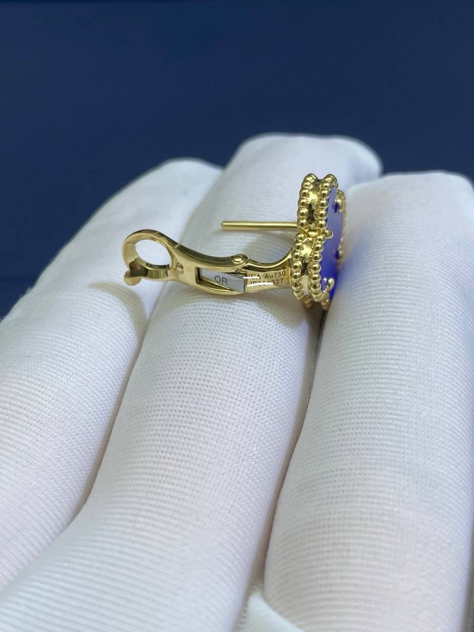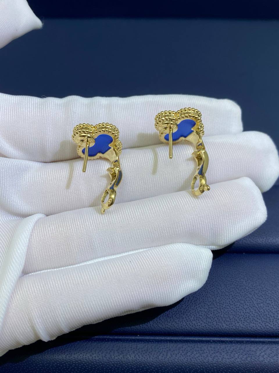 Inspired by the iconic clover leaf, these exquisite ear clip earrings are crafted in 18k yellow gold and feature deep, vibrant lapis lazuli inlays. The signature quatrefoil motifs showcase perfect symmetry, while hinged omega backs and detachable stems offer versatile and comfortable wear. A timeless design that blends bold color with refined elegance.