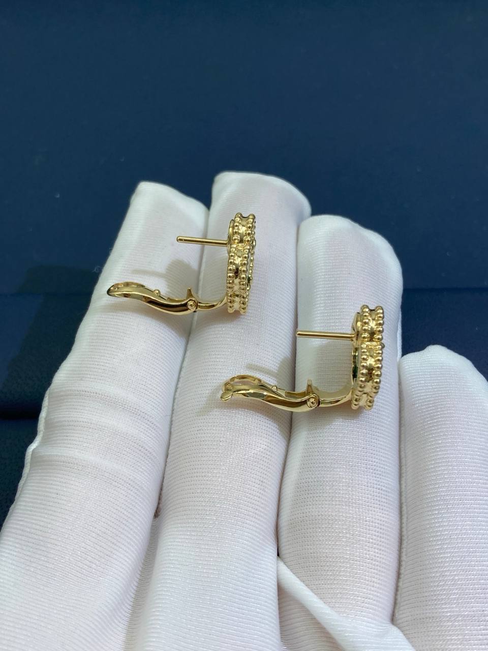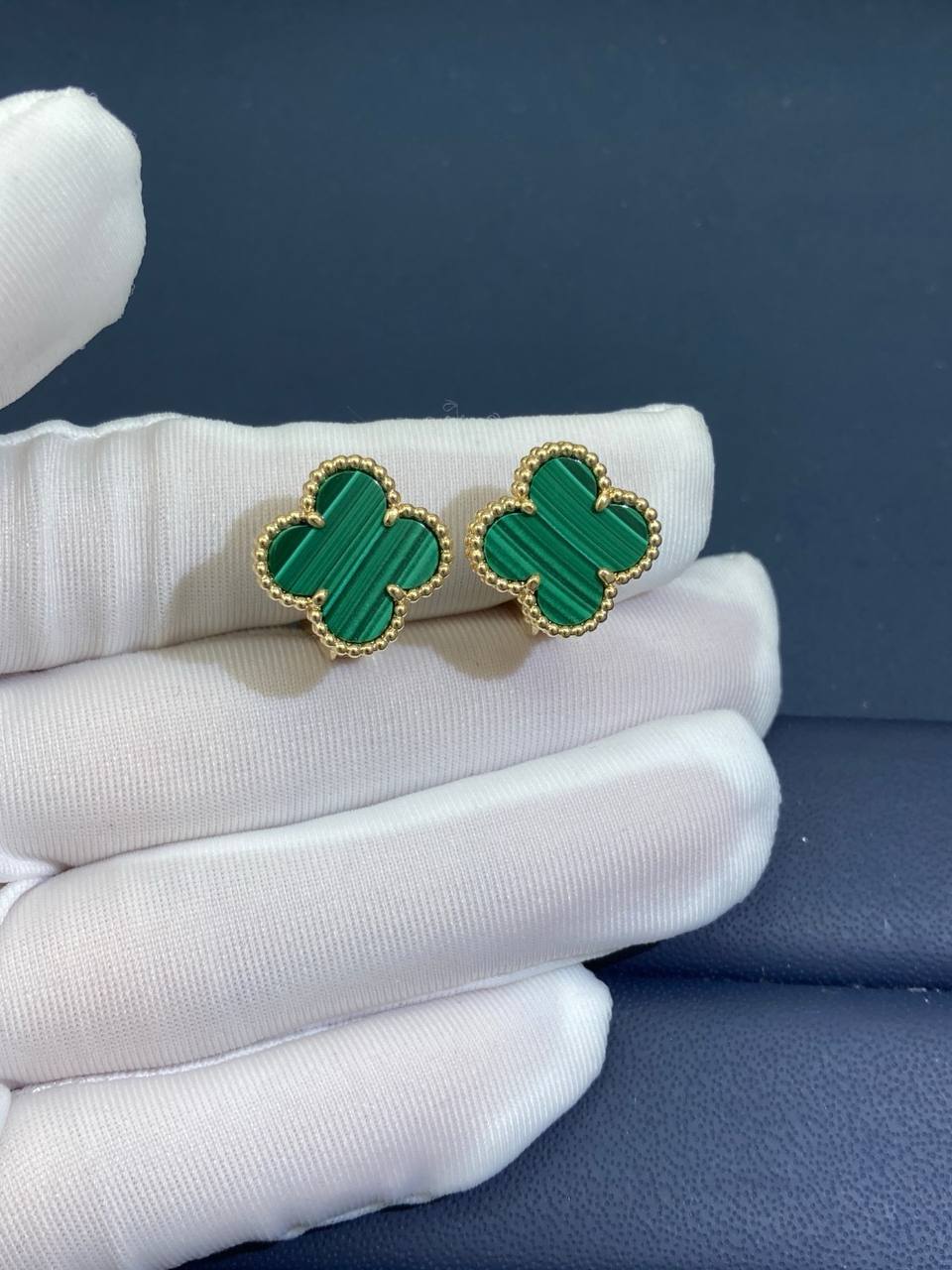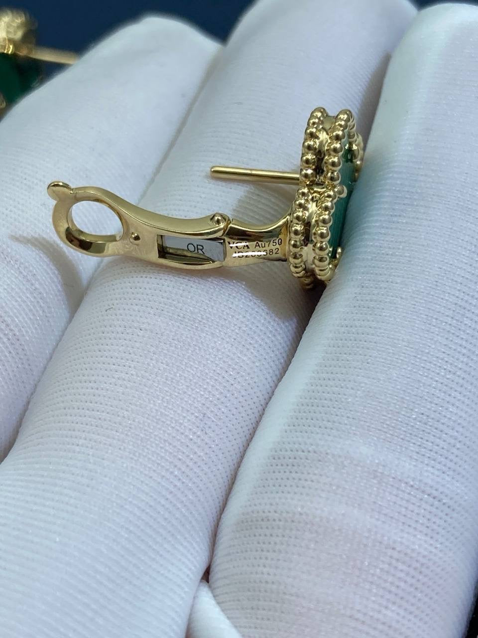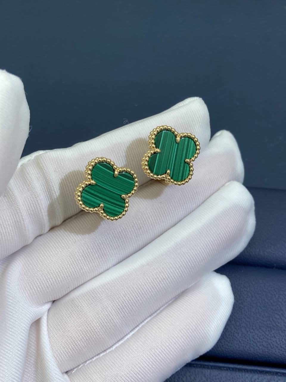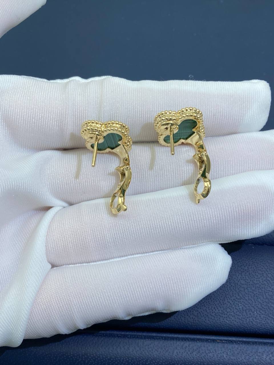 Inspired by the iconic clover leaf, these elegant ear clip earrings are crafted in 18k yellow gold and feature rich green malachite inlays. The signature quatrefoil motifs showcase perfect symmetry, while hinged omega backs and detachable stems provide versatile, comfortable wear. A timeless design that combines vibrant color with refined sophistication.