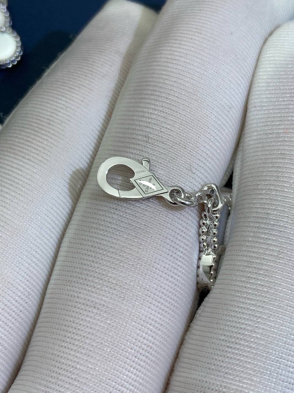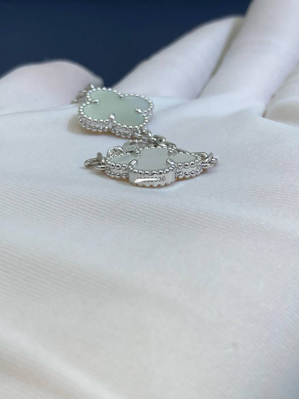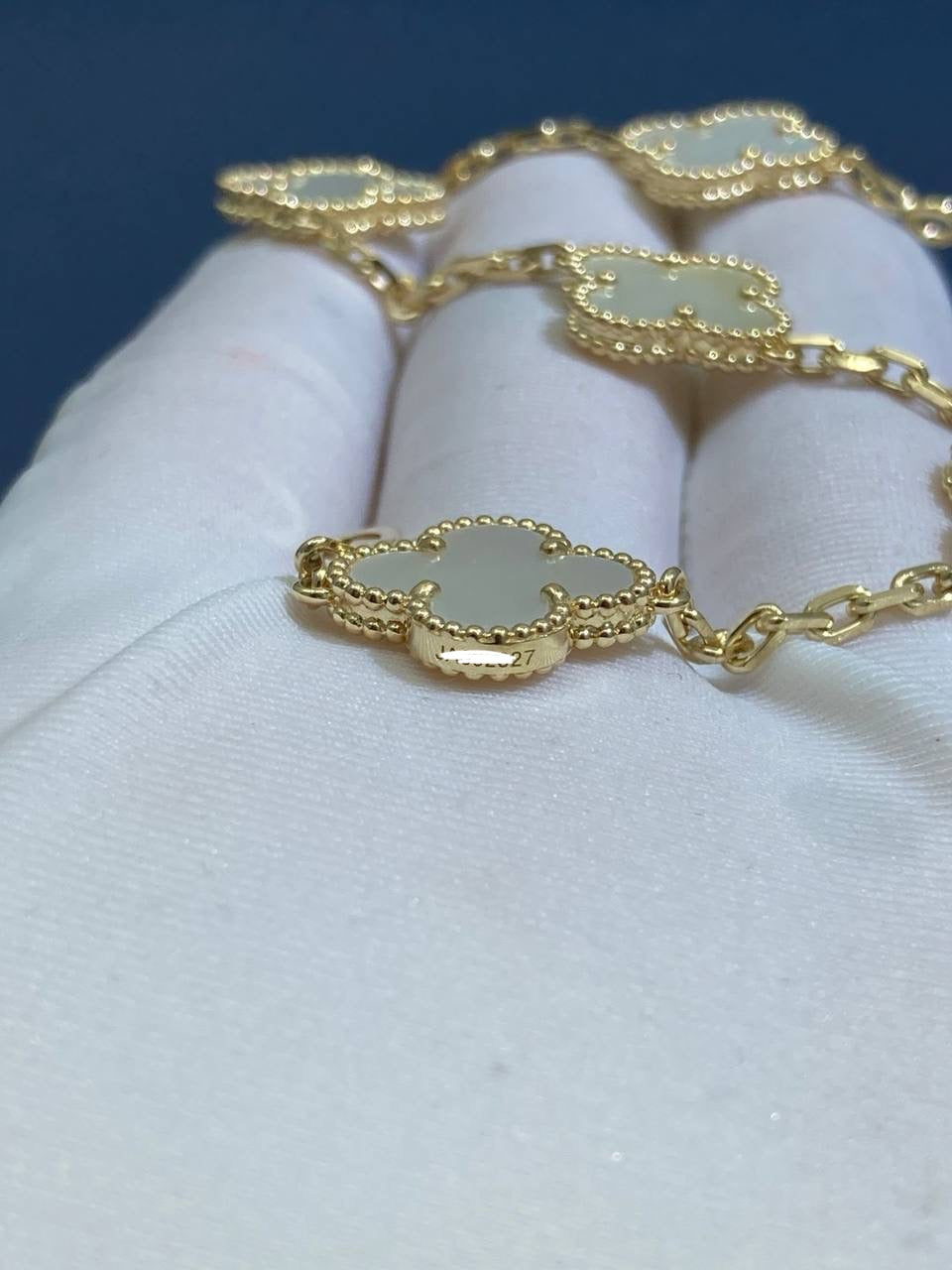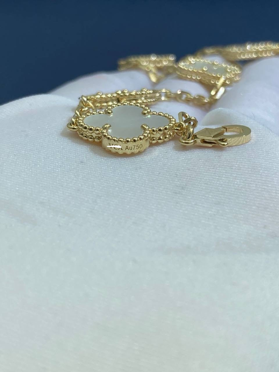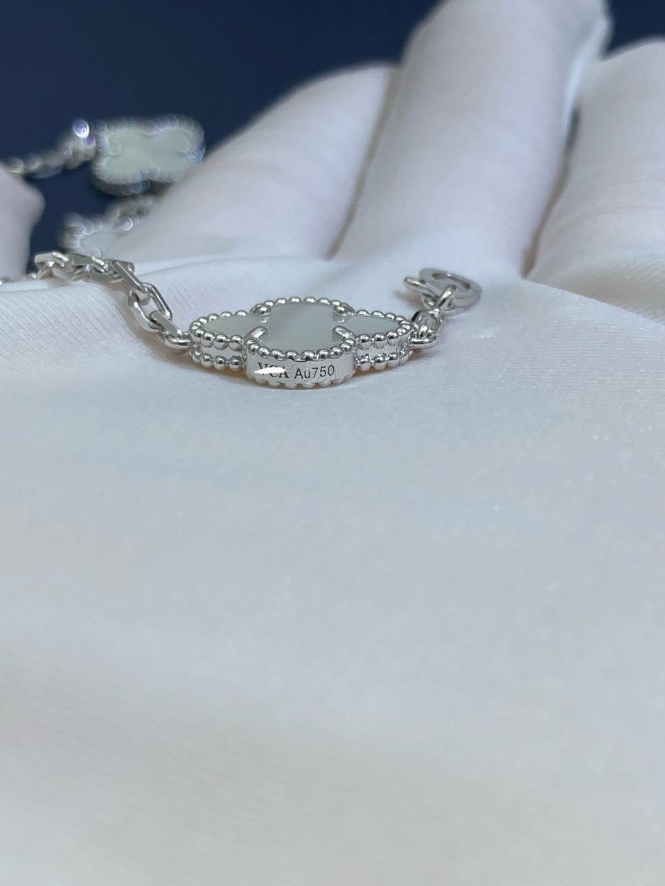 Since 2007, this collection has brought classic elegance to women around the world. This charming bracelet is crafted in 18k yellow or white gold and features five clover-inspired motifs inlaid with luminous white mother-of-pearl. The delicate motifs, symbolizing luck, are gracefully linked by a fine gold chain secured with a lobster clasp. A versatile and timeless piece, it can be customized to your preferred length.