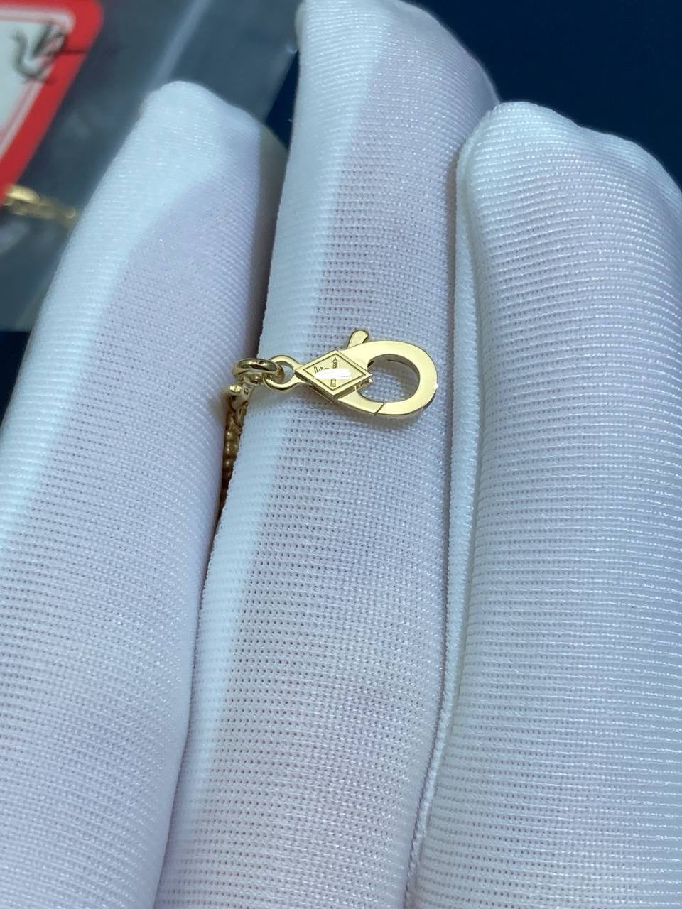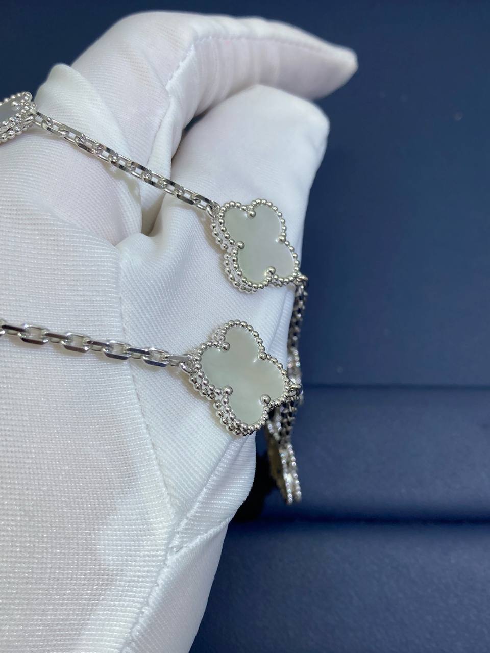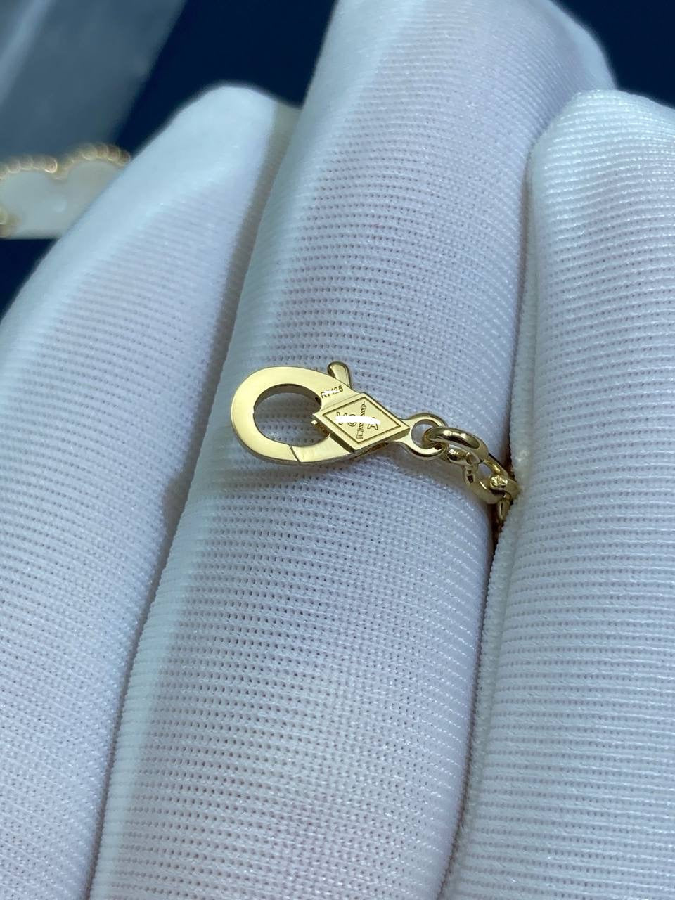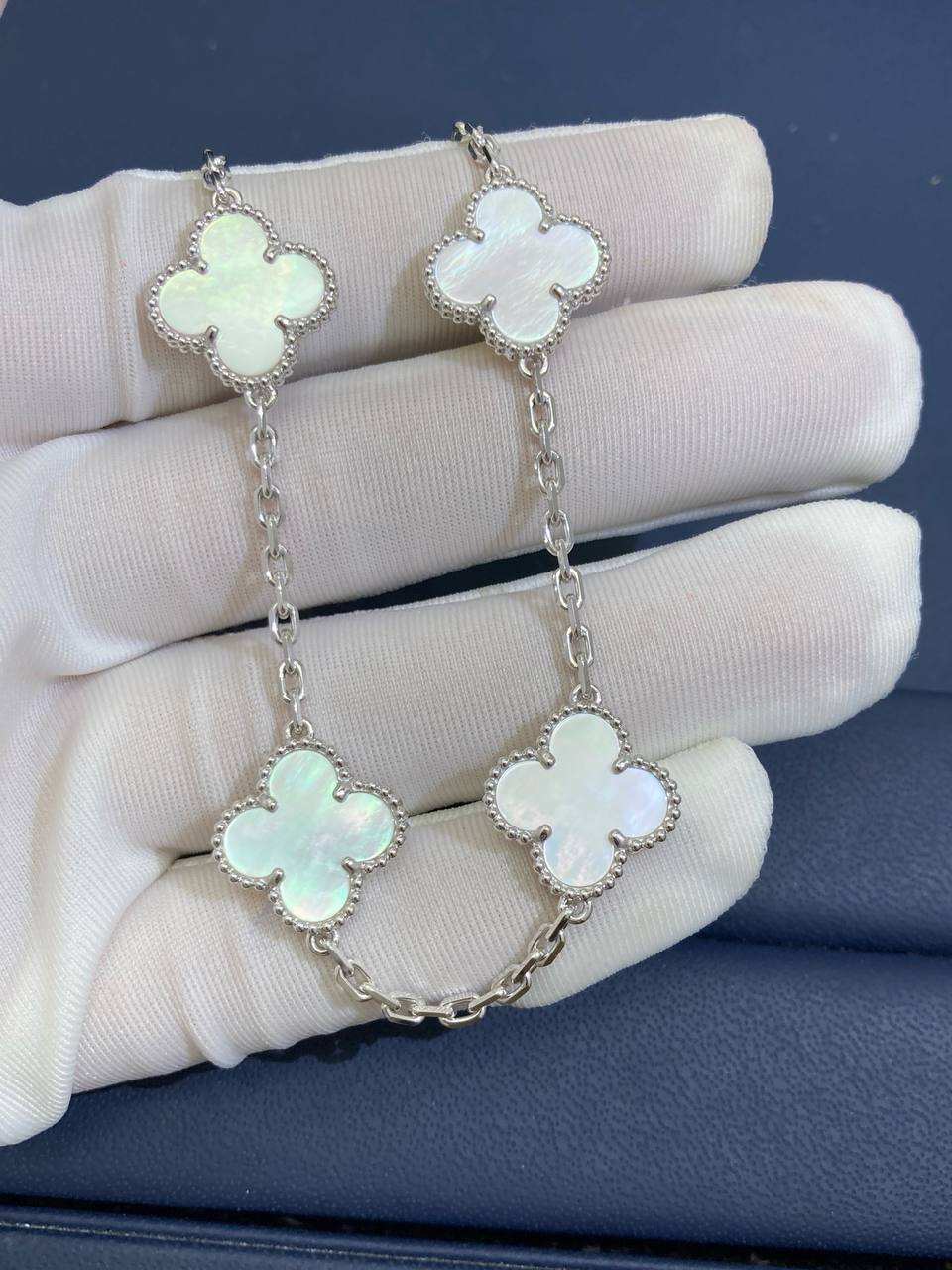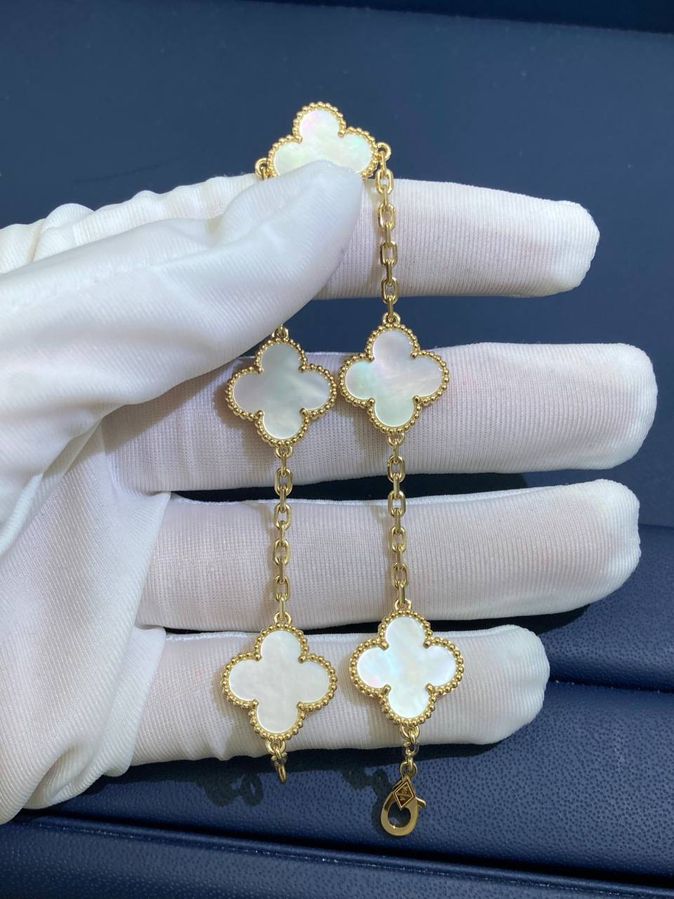 Since 2007, this collection has brought classic elegance to women around the world. This charming bracelet is crafted in 18k yellow or white gold and features five clover-inspired motifs inlaid with luminous white mother-of-pearl. The delicate motifs, symbolizing luck, are gracefully linked by a fine gold chain secured with a lobster clasp. A versatile and timeless piece, it can be customized to your preferred length.