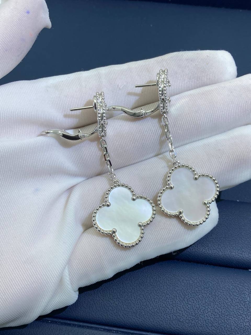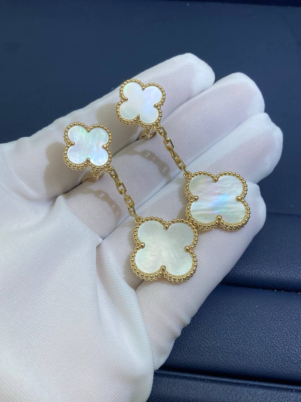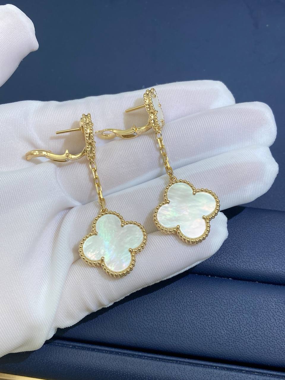 Crafted in 18k yellow gold, these stunning 2-motif drop earrings exude evening glamour with their refined elegance and graceful movement. Each earring features two luminous white mother-of-pearl clovers—one smaller and one larger—framed by delicate beaded edges. The smaller motif is set on a pierced post with a hinged clip back, while the larger clover is suspended by a seven-link chain, creating fluidity and sparkle with every step.