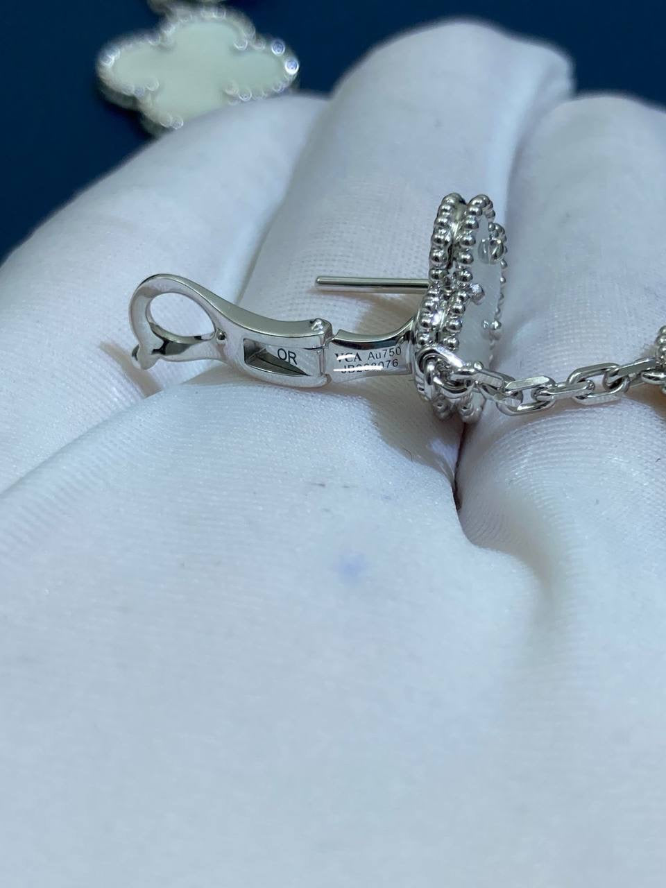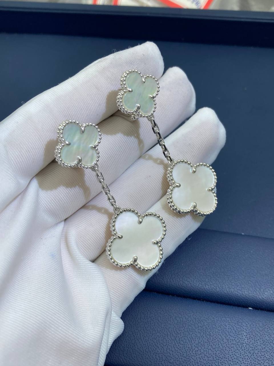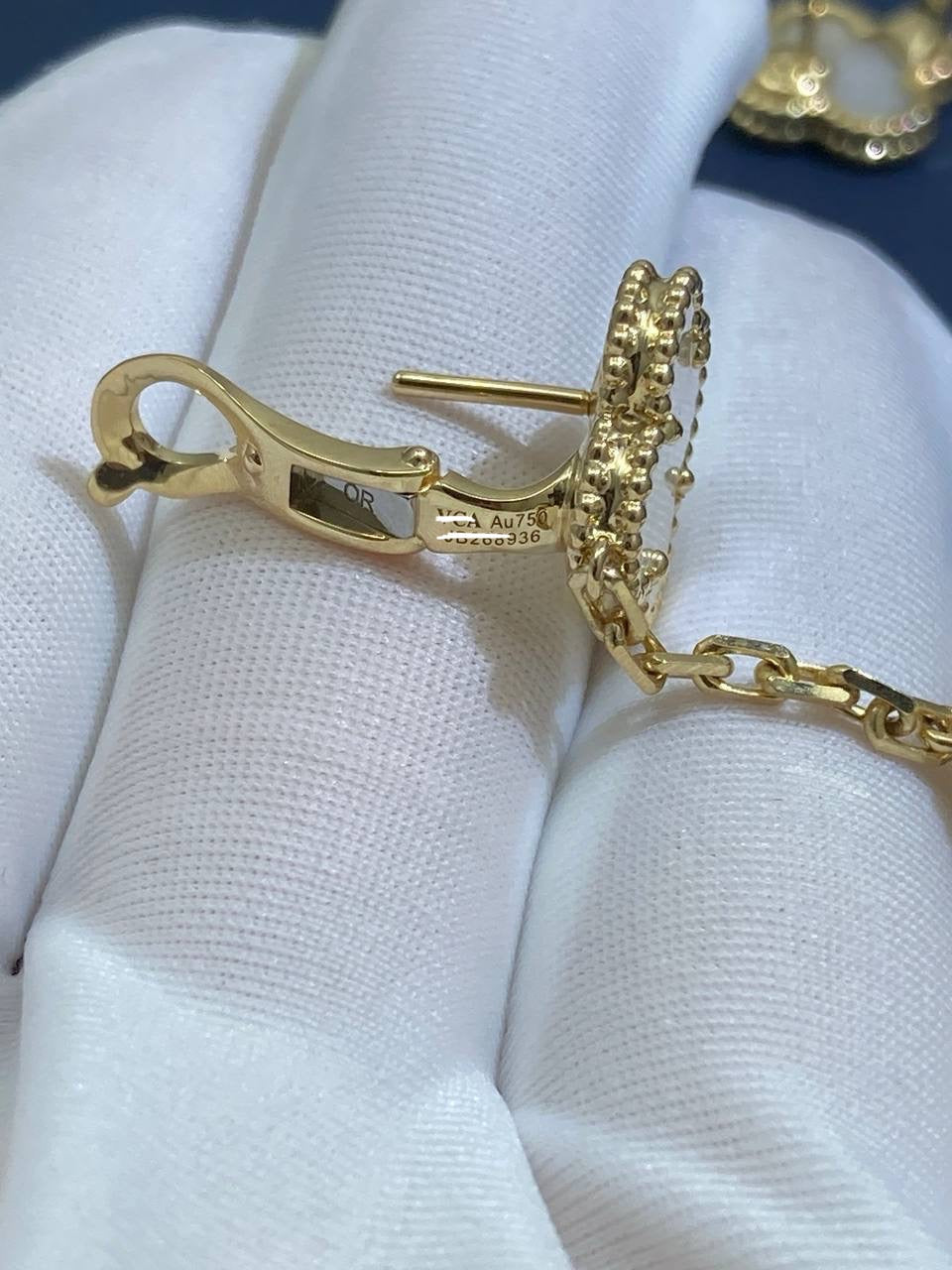 Crafted in 18k yellow gold, these stunning 2-motif drop earrings exude evening glamour with their refined elegance and graceful movement. Each earring features two luminous white mother-of-pearl clovers—one smaller and one larger—framed by delicate beaded edges. The smaller motif is set on a pierced post with a hinged clip back, while the larger clover is suspended by a seven-link chain, creating fluidity and sparkle with every step.