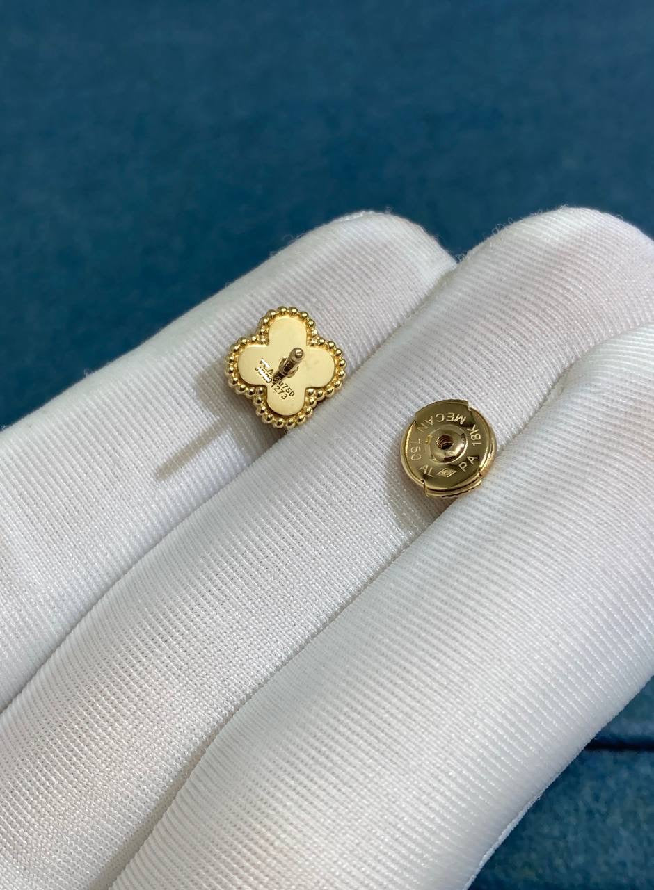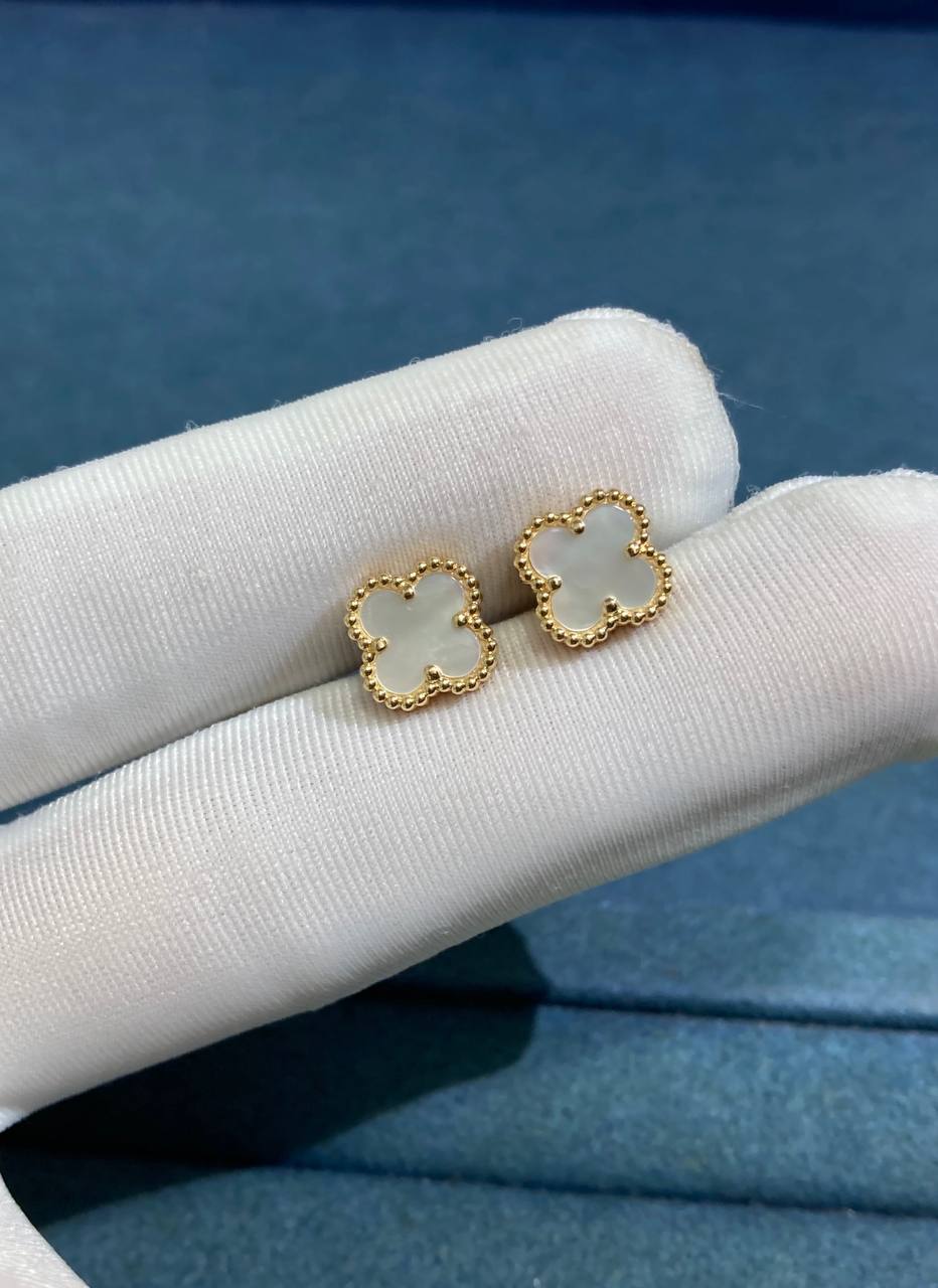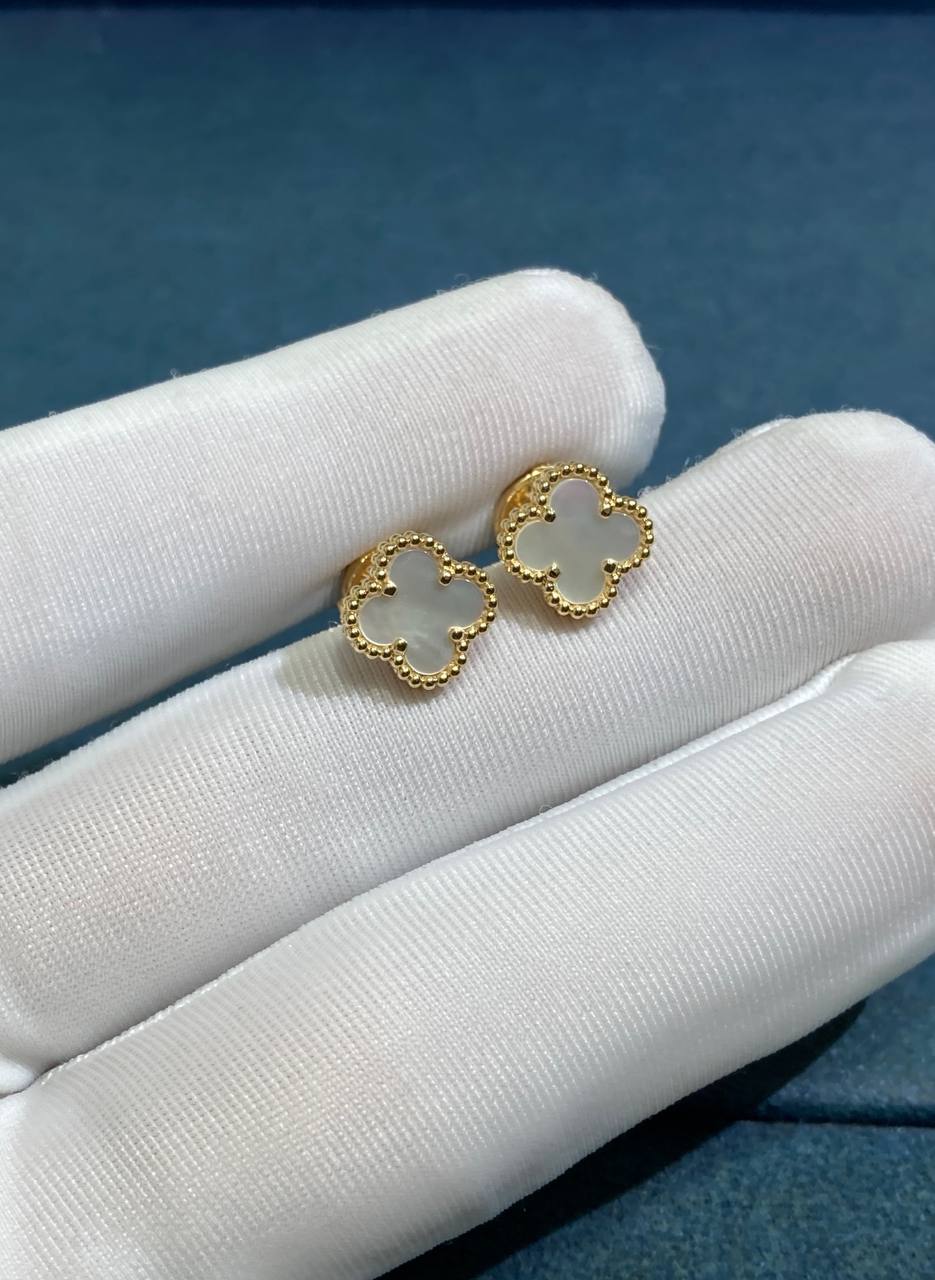 An iconic pair of 18k gold earrings featuring the timeless four-leaf clover motif, a symbol of luck and elegance. Each earring is framed with a delicate beaded edge and set at the center with luminous white mother-of-pearl, creating a soft, radiant contrast against the precious metal. Available in either yellow or white gold, this design offers a refined balance of classic charm and contemporary sophistication.