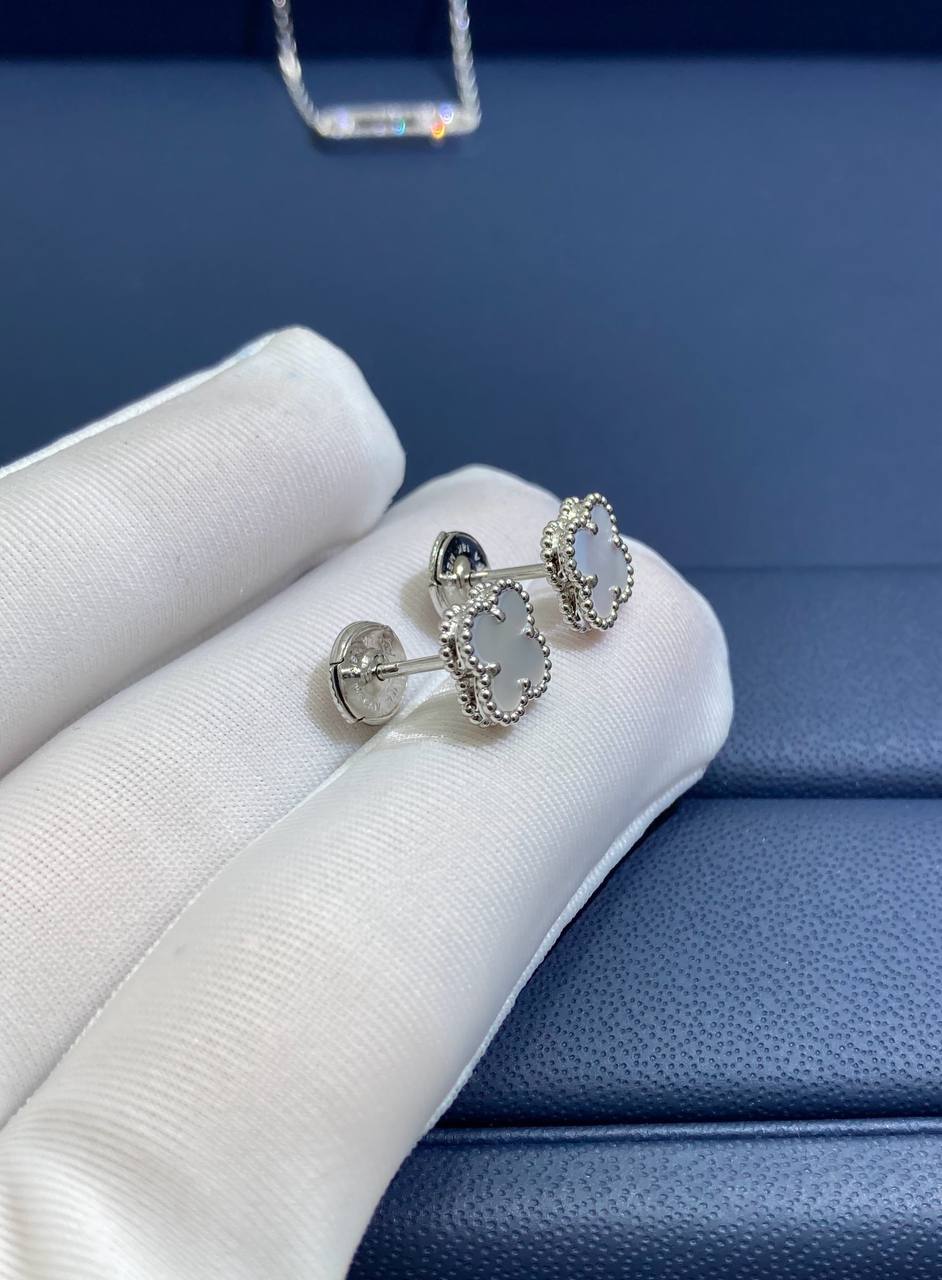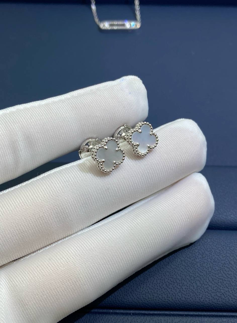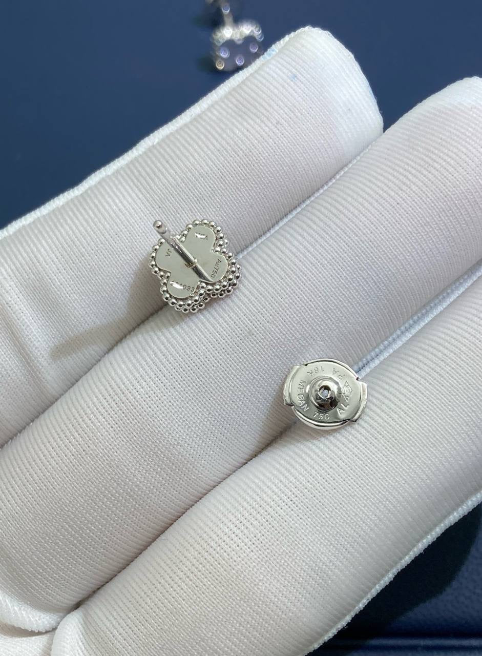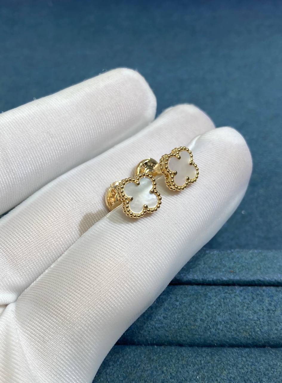 An iconic pair of 18k gold earrings featuring the timeless four-leaf clover motif, a symbol of luck and elegance. Each earring is framed with a delicate beaded edge and set at the center with luminous white mother-of-pearl, creating a soft, radiant contrast against the precious metal. Available in either yellow or white gold, this design offers a refined balance of classic charm and contemporary sophistication.