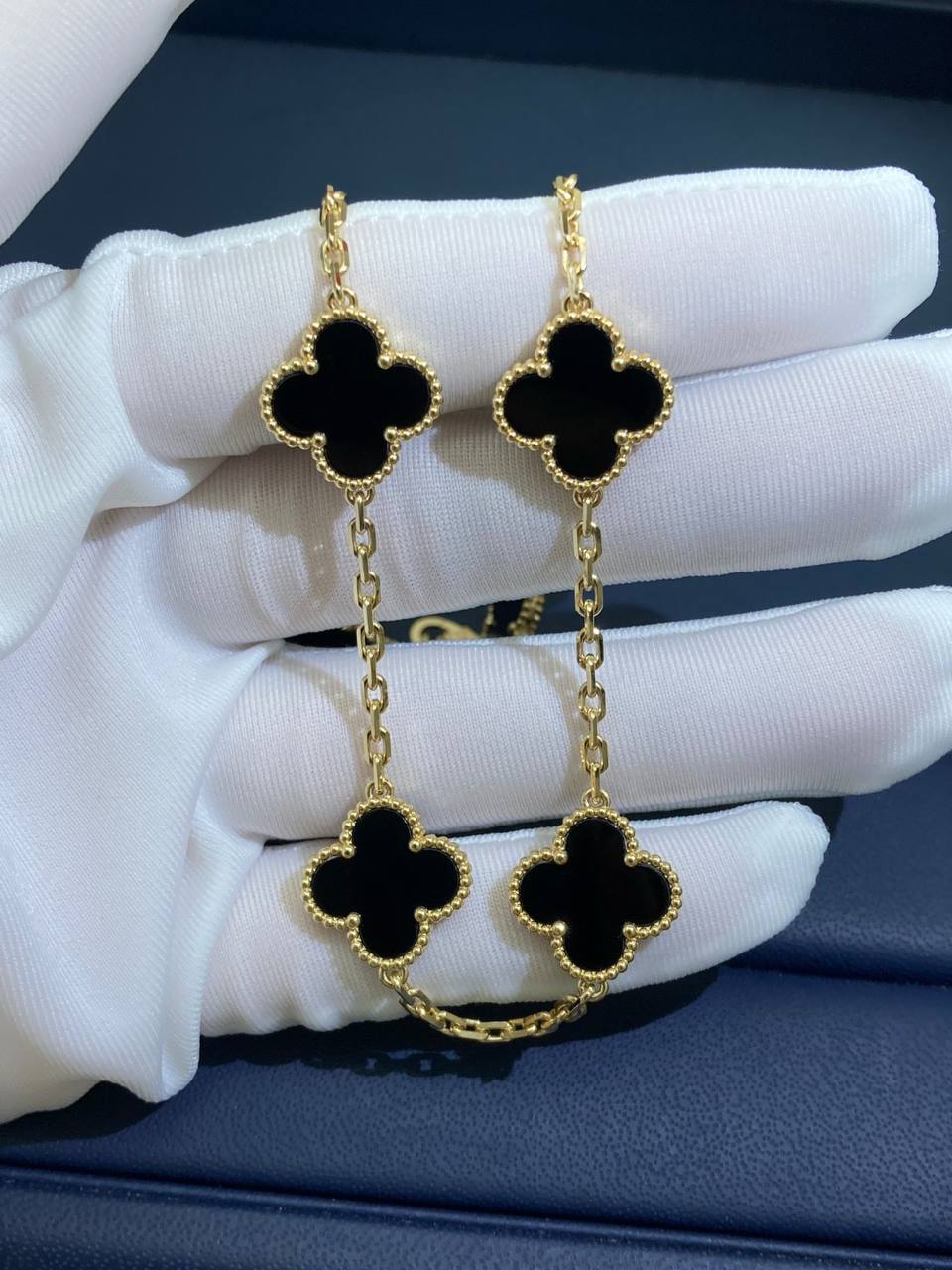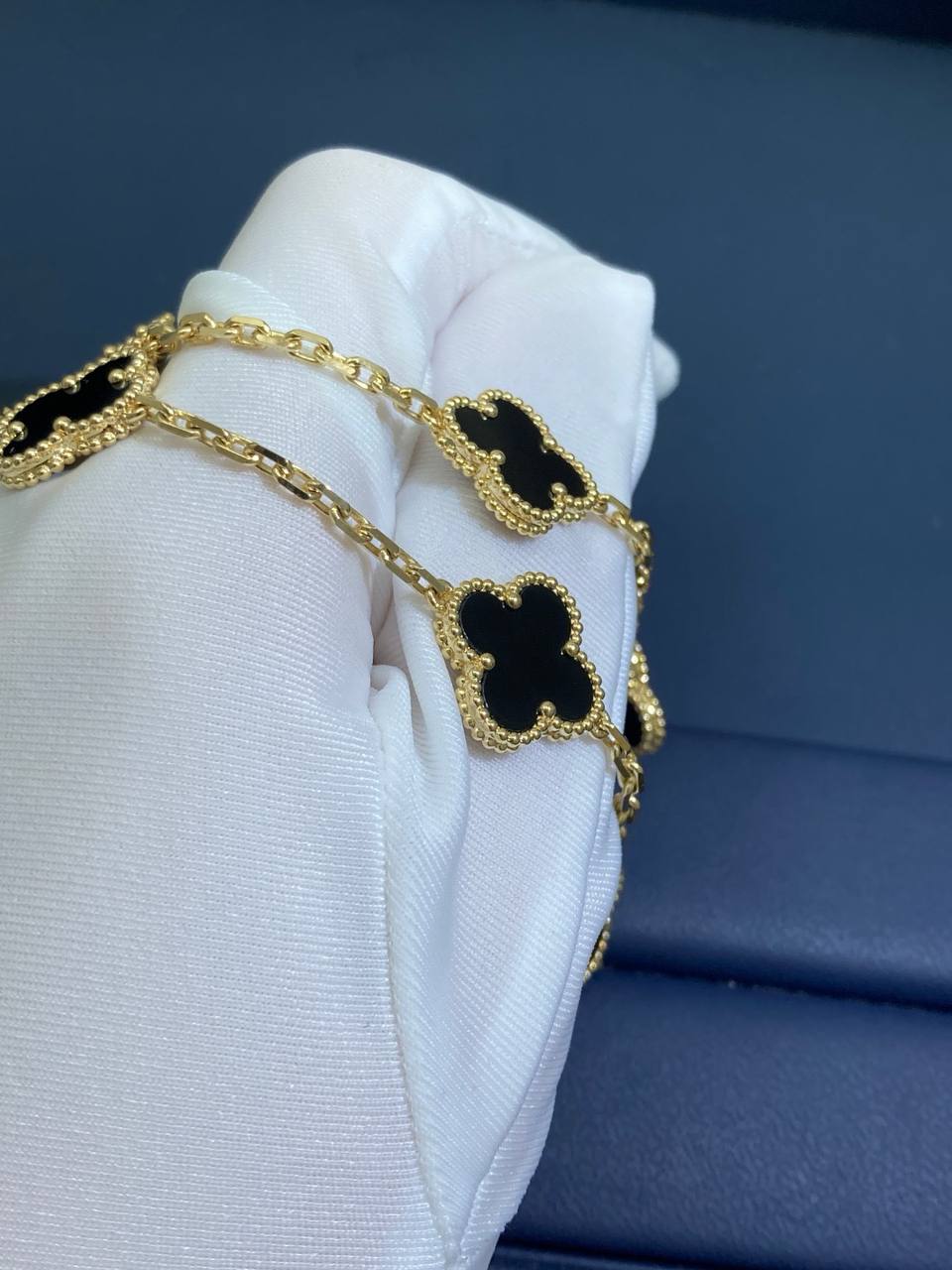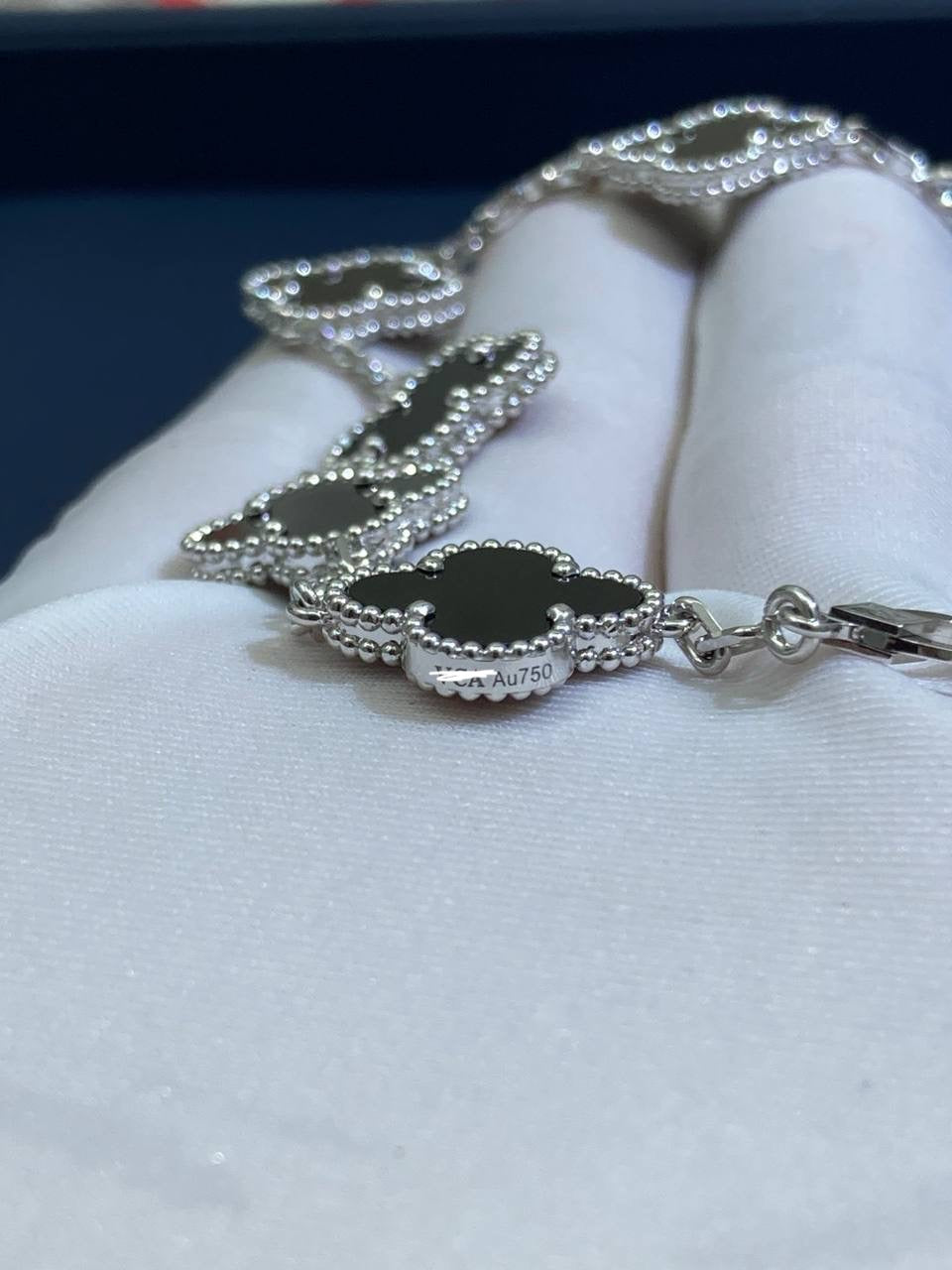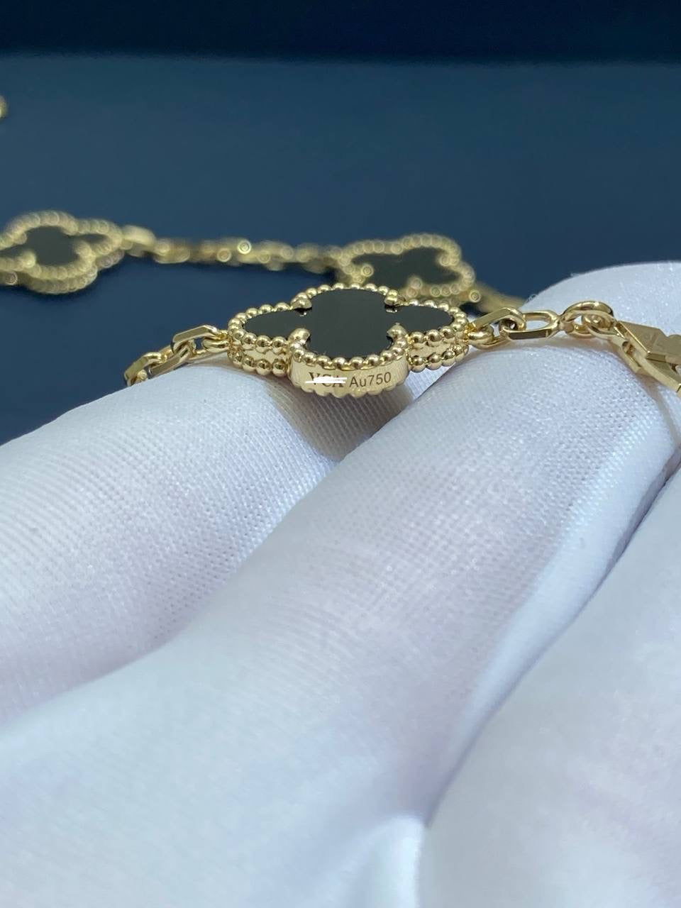 Timeless elegance meets refined craftsmanship in this iconic bracelet, crafted in 18K gold. Five signature clover motifs, each framed with delicate beaded edging, are inlaid with polished black onyx, creating a striking contrast against the luminous gold. Suspended from a fine chain and secured with a hallmark clasp, this piece is a true symbol of sophistication and luck.