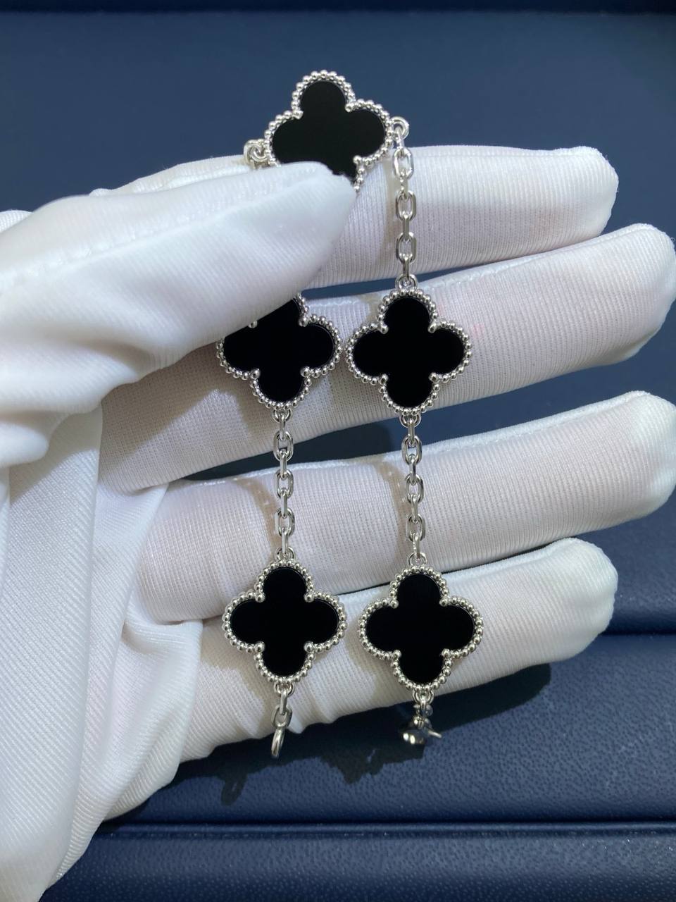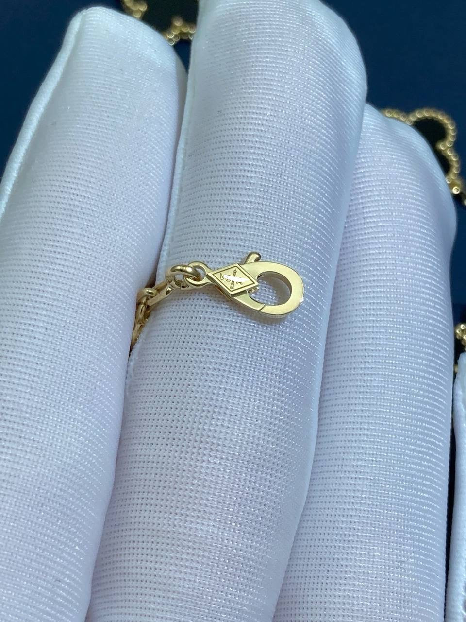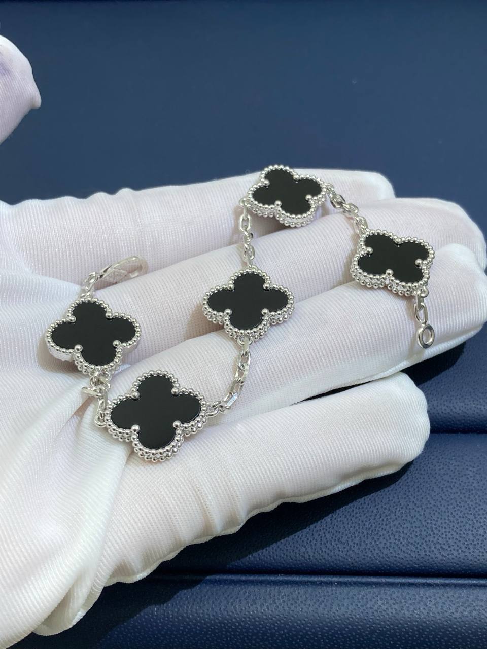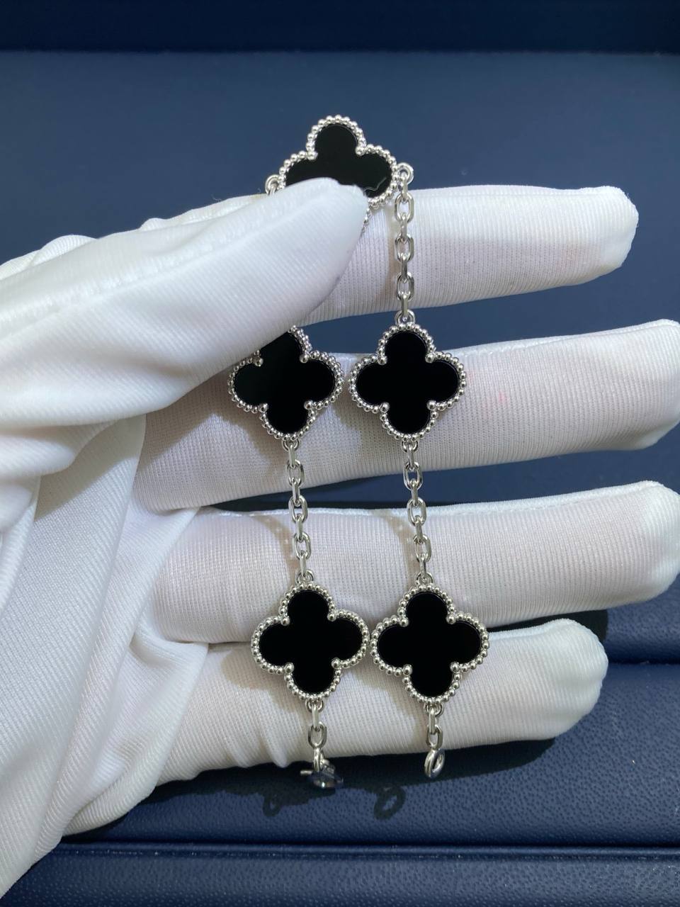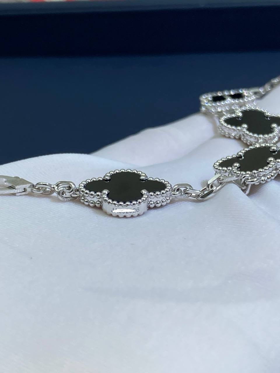 Timeless elegance meets refined craftsmanship in this iconic bracelet, crafted in 18K gold. Five signature clover motifs, each framed with delicate beaded edging, are inlaid with polished black onyx, creating a striking contrast against the luminous gold. Suspended from a fine chain and secured with a hallmark clasp, this piece is a true symbol of sophistication and luck.