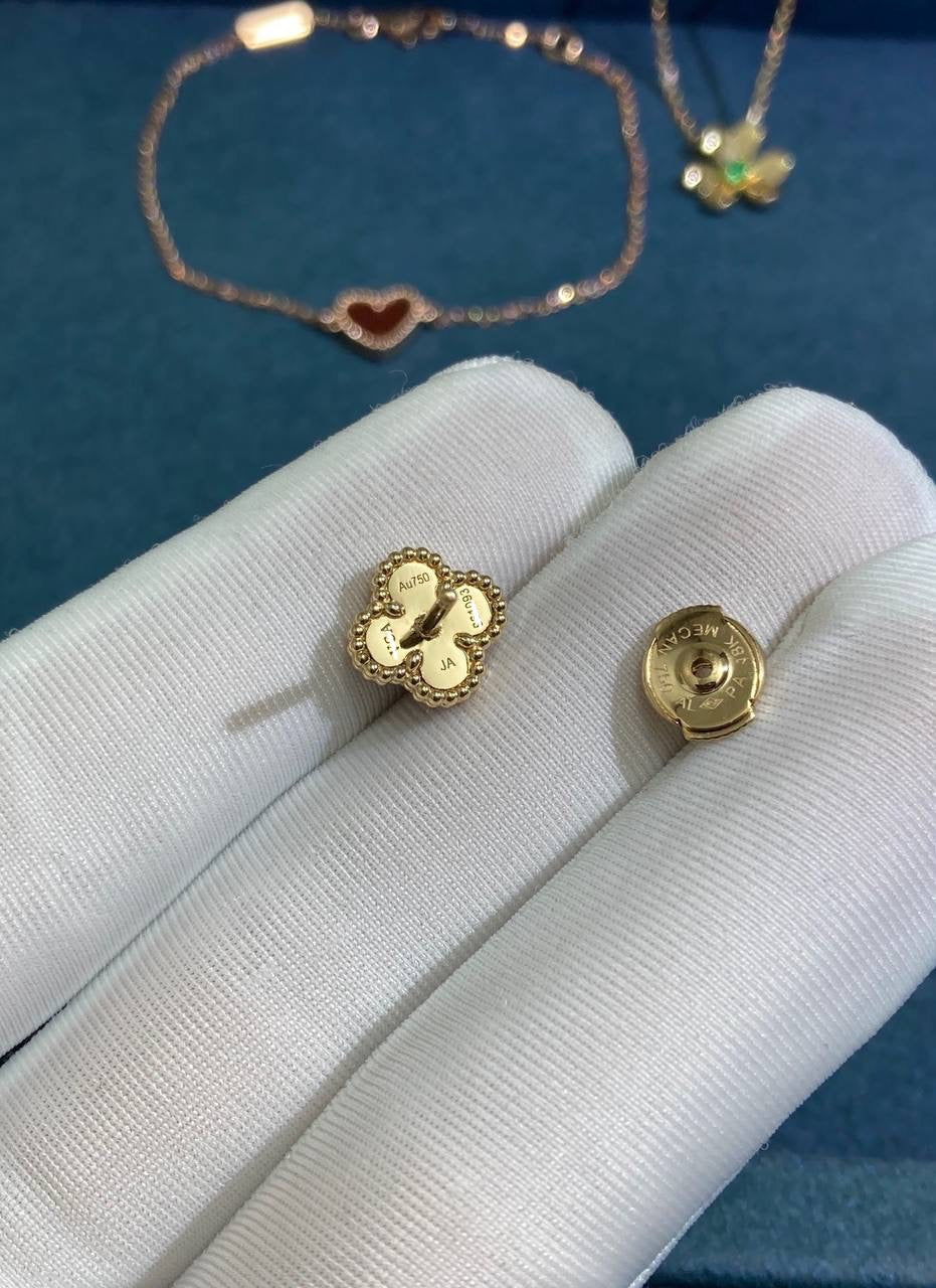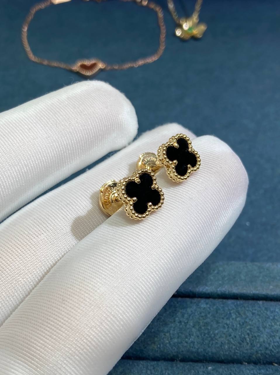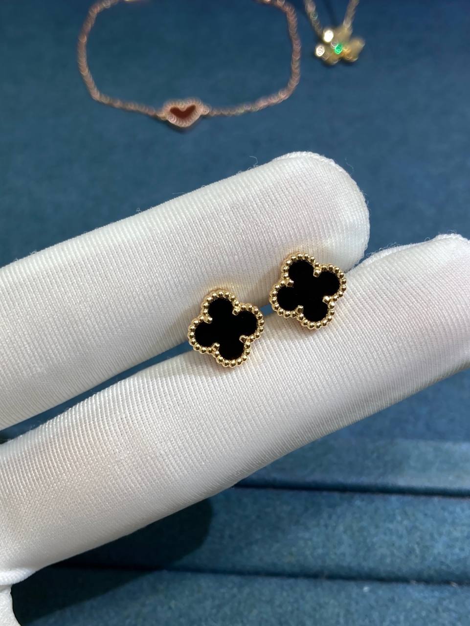 An iconic pair of 18k yellow gold earrings showcasing the timeless four-leaf clover motif, a symbol of luck and elegance. Each earring is framed with a delicate beaded edge and set with a deep black onyx inlay, offering a striking contrast against the warm glow of yellow gold. A refined design that balances classic charm with modern sophistication.