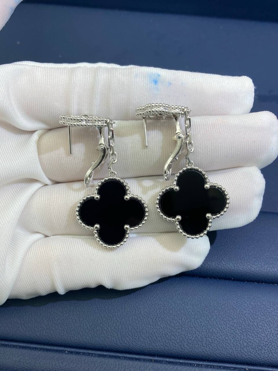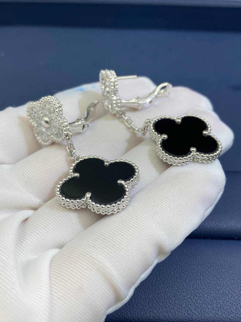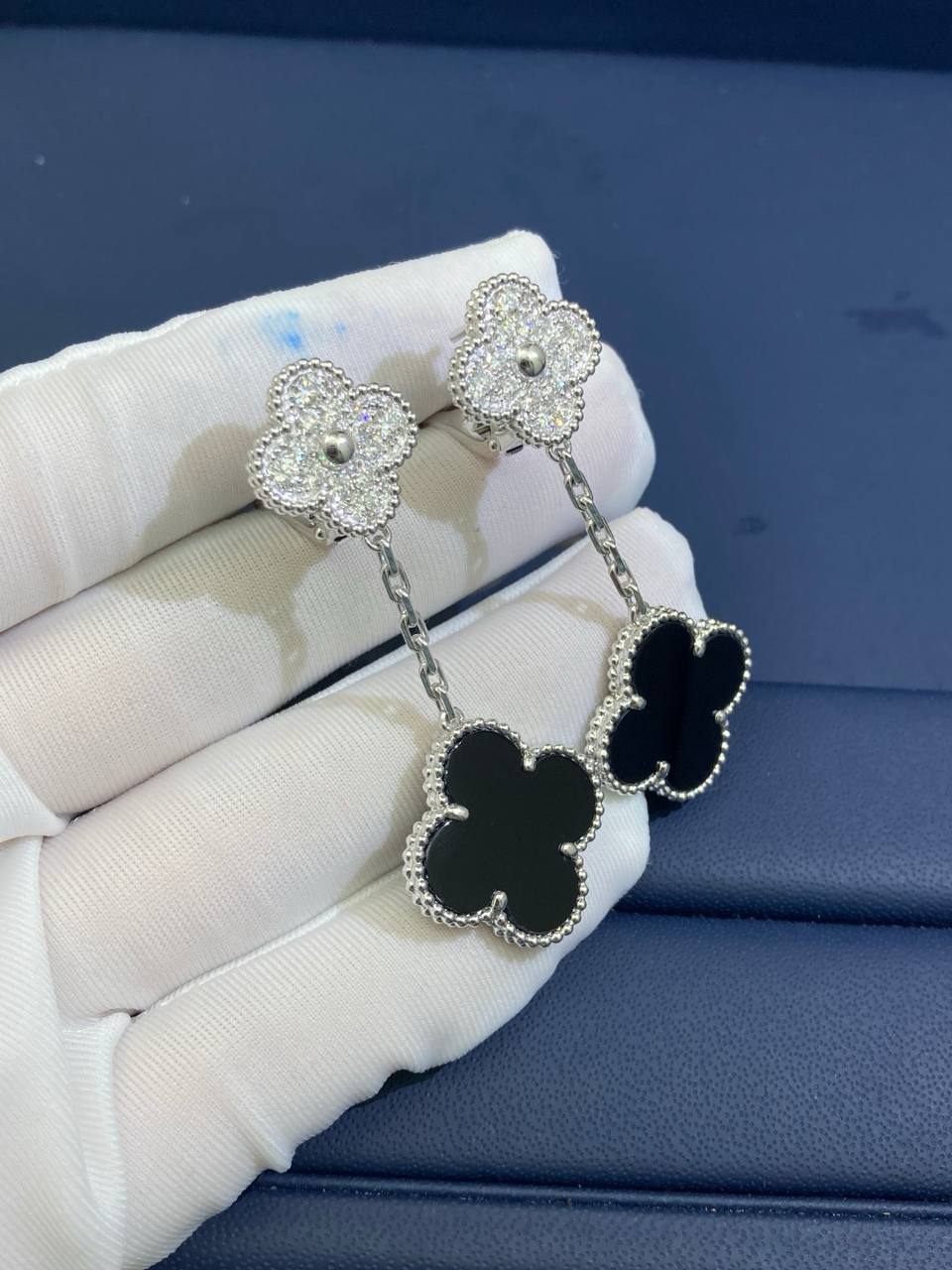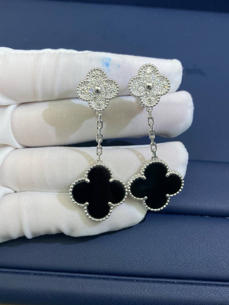 These refined earrings are crafted in 18k white gold and feature a striking double four-leaf clover motif. The upper motif dazzles with pavé-set round brilliant-cut diamonds, while the lower motif is inlaid with deep black onyx, both framed by delicate beaded edging. Set with 24 diamonds totaling 0.97 ct, the design balances timeless elegance with bold contrast. Finished with post and lever-hinged fittings, they offer both sophistication and comfort.