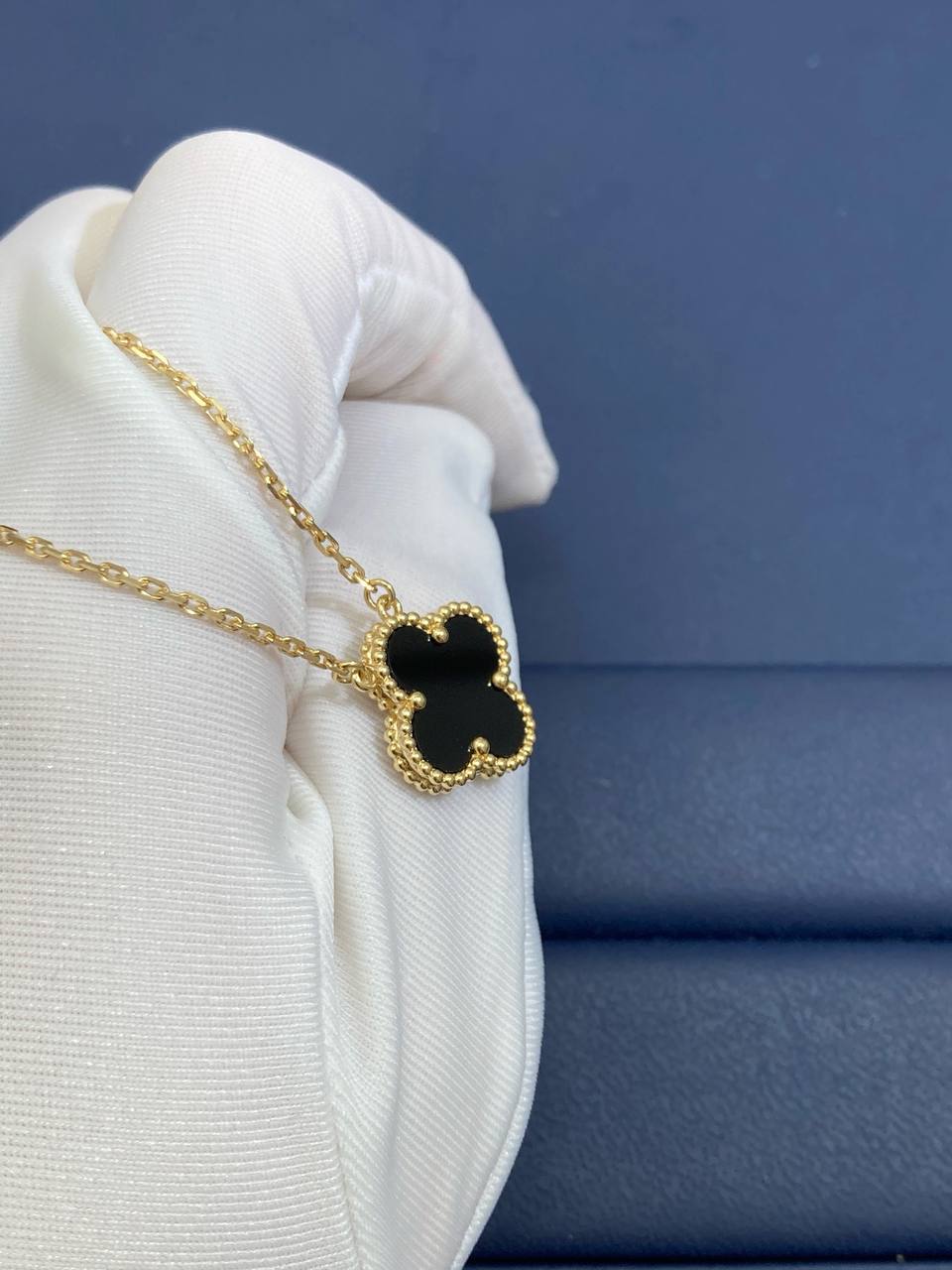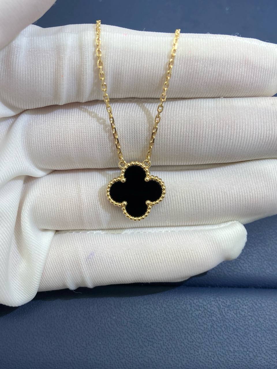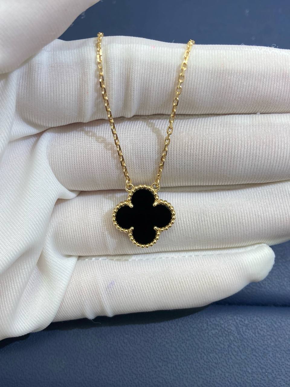 This refined collar-length necklace is crafted in 18k yellow gold and features a single clover pendant inlaid with deep black onyx. Finished with a hallmark clasp, the design is both timeless and versatile, perfect for everyday elegance.